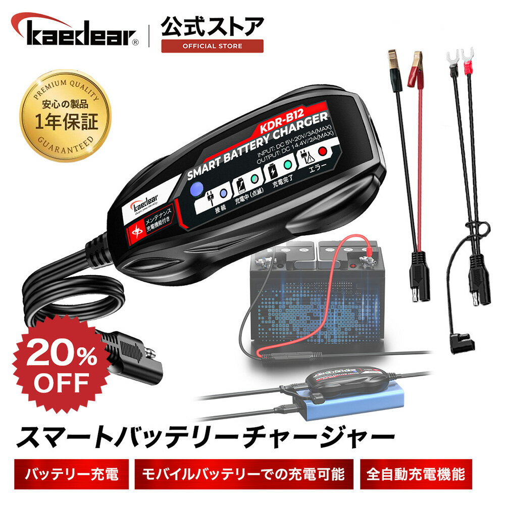 商品情報 スマートバッテリーチャージャー USB入力対応バッテリー充電器 コンセントがない環境でも、手軽にバッテリー充電が可能なUSB入力タイプのバッテリー充電器です。DC12Vの鉛バッテリーやリチウムイオンバッテリーに対応し、幅広い用途にご使用いただけます。 USB電源から充電可能 従来の100AC電源ではなく、USB電源を利用して充電する設計です。ポータブルバッテリーやモバイルバッテリーを電源にできるため、駐車場にコンセントがない場合でもバッテリー充電が可能。 ※... 3,988円 税込 送料込 カードOK レビュー95件 株式会社 Kaedear ![]() | ||