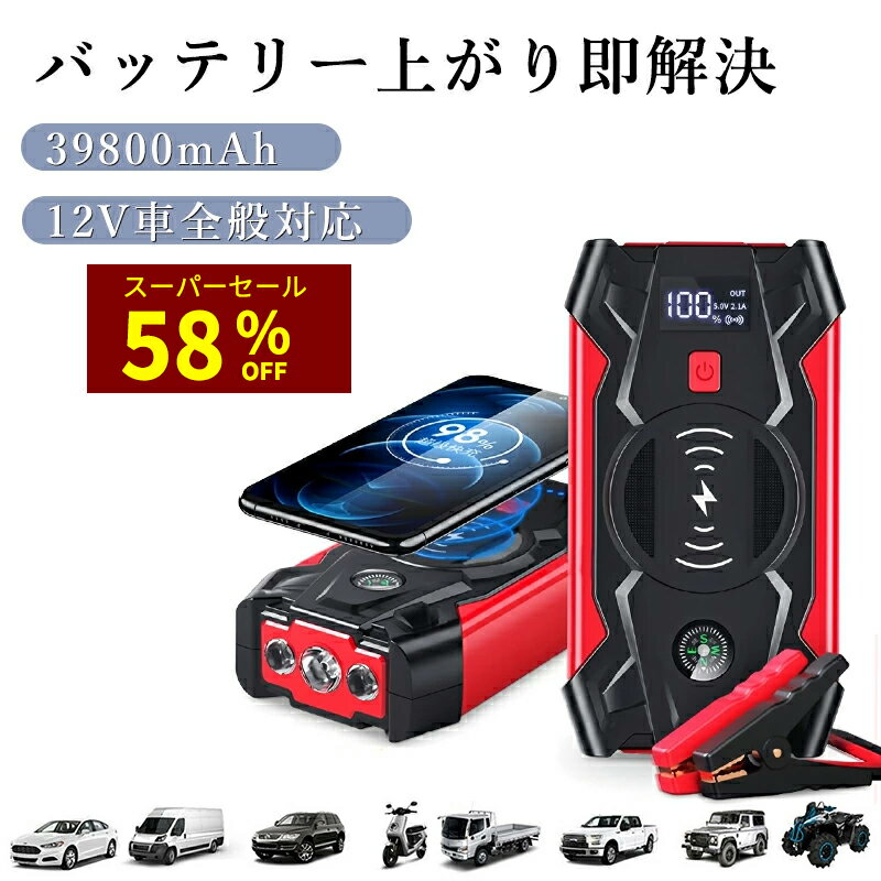 商品情報【商品詳細】サイズ:190×90×45mm動作温度:-20〜80℃対応車種:ガソリン車最大8L / ディーゼル車最大6L対応電圧:12V照明モード:LED常灯/ストロボ/SOS採用技術:QDSP高速放電スタート技術保護機能:過充電/逆接続/短路/過放電/逆流/過熱/磁気干?保護機能【主な機能】■6.0Lまでのガソリン車、4.0Lまでのディーゼル車対応のジャンプスターター■超大容量39800mAhバッテリーで、エンジン始動はもちろん、スマホなどの充電も可能■USB有線充電とワイヤレス... 7,812円 税込 送料込 カードOK レビュー7件 中川屋商事 ![]() | ||