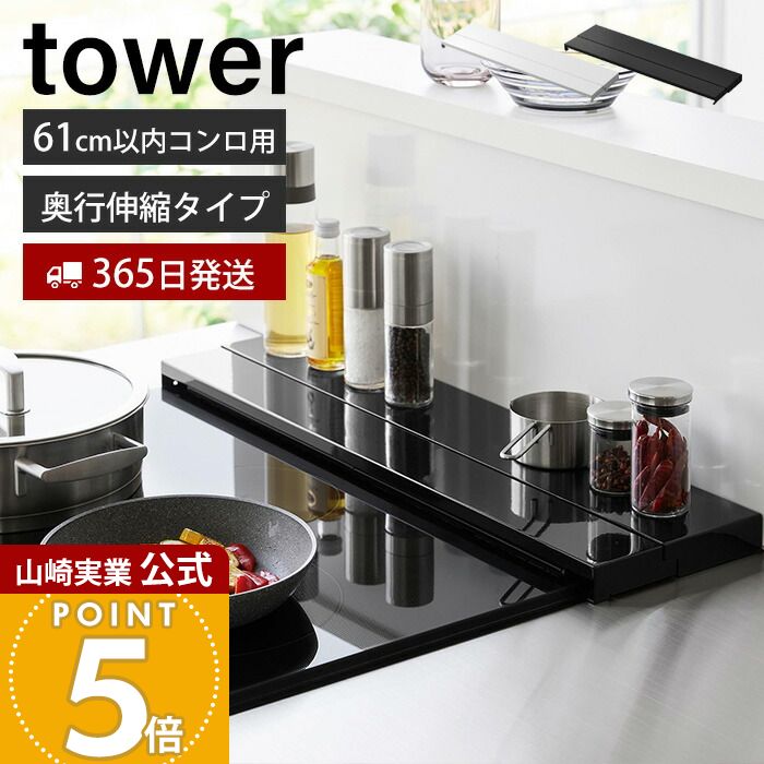 ■Detail -商品説明- 山崎実業 tower 奥行伸縮排気口カバー タワー 60cmコンロ用/75cmコンロ用 はこんな商品です。 排気口~コンロの奥までの広い範囲の汚れを防止!奥行き伸縮タイプの排気口カバーです。 グリルを使用するときには、カバーをスライドして収納するだけ。調味料なども小物を上に置いたままでも伸縮できます。 ゆったりとした奥行きがあり、フライパンなどの一時置きのスペースとしても便利。 分解して水洗いできるので、お手入れも簡単です。 ■Delivery -配送に関して- ●北海道・沖縄・離島は追加送料がかかります。注文確認後、送料修正しご案内いたします。 ≫送料・配送についての詳細はこちらから ■attention -注意事項- ●お客様都合の返品・交換はお受けしておりません。→詳しくはこちら ●注文段階では、[送料],[金額変更等]が正しく計算されない場合がございます。後ほど当店よりお送りするメールにてご確認ください。 ●商品の色は、画像と実物とでは多少異なる場合がございます。色・イメージが違う等の理由による返品は一切お受けできません。予めご了承下さい。tower奥行伸縮排気口カバー タワー 60cmコンロ用/75cmコンロ用 排気口のきれいを保つtowerの大人気商品「排気口カバーシリーズ」に、奥行き伸縮タイプが新登場。 ビルトインコンロやIHの排気口から壁までをしっかりとカバーして、油や調理くずが隙間に入り込んでしまうのを防ぎます。 最大16.5cm奥行きがあるので、鍋やフライパンの一時置きスペースとしても便利。 グリルを使用する時には、カバーをスライドさせて収納するだけ。本体を移動することなく排気口をオープンにでき、奥側のカバーには調味料などの小物を置いたまま伸縮できます。 65cmコンロ用と75cmコンロ用の2サイズをご用意しております。コンロのサイズに合わせてお選びください。 一度汚れてしまうとお掃除が大変な排気口周り。排気口~壁までをしっかりとカバーしたいなら、奥行き伸縮できるこちらがおすすめです。 奥行き約10~16.5cmまで伸縮可能で、壁まで隙間なくカバー。意外と遠くまで跳ねてしまう油や調理くずなどの汚れを防止します。 グリルを使用する際には、カバーを奥までスライドさせて排気口をオープンに。 カバー本体を移動させる必要がないので、排気口カバーを使っているとグリル調理が面倒…なんてお悩みも無くなります。 一番奥まで押し込んでも、次に伸ばすときに掴みやすい形状になっており、細やかな配慮にグッとくるデザインです。 手前のカバーは奥側のカバーの下に収納されるので、奥側には調味料などの小物を置いたまま伸縮できます。 グリルを使うたびに上に置いていた調味料を一旦移動させる…なんて面倒もなし。 排気口をカバーするだけでなく、コンロ奥のスペースを有効に活用! 最大16.5cmのたっぷりとした奥行きがあるので、よく使う調味料や食材、余熱を取ったお鍋やフライパンなどの一時置きスペースとしても便利。今までは少しはみ出してしまっていたフライパンなども、収まりやすい奥行きサイズです。 上下カバーの段差も少なく、置いたものがガタつかない安定性も◎ ※可燃性の物、熱したばかりの物は置かないで下さい。 表面は光沢のあるつるつるとした素材なので、油汚れが気になったらササっと拭き掃除できれいに。 すみずみまで洗いたいときには分解して水洗いも可能。フラットでシンプルな形で落としにくい汚れもつきにくく、定期的なお掃除もすぐに完了。 43~80cm対応 43~80cm対応 44~80cm対応 49~90cm対応 42.5~75cm対応 60cmコンロ用75cmコンロ用 60cmコンロ用 60cmコンロ用75cmコンロ用 ⇒ 商品カテゴリー> コンロ周り ⇒ コンロ横で使える「隠せる調味料ラック タワー 2段」 ⇒ towerでキッチンを整える [ NEW ] 大人気のtowerなど山崎実業の最新アイテムはこちら ●商品の詳細● 品 名 tower 奥行伸縮排気口カバー タワー 60cmコンロ用/75cmコンロ用 サイズ [60cm]約 幅64 × 奥行10~16.5 × 高さ3.7cm(内寸:約 幅62 × 高さ2.2cm) [75cm]約 幅79 × 奥行10~16.5 × 高さ3.7cm(内寸:約 幅77 × 高さ2.2cm) 耐荷重 約 10kg ※伸縮時:約 3kg 材 質 本体:スチール(粉体塗装)、滑り止め:シリコーン 重 量 [60cm]約 1400g [75cm]約 1650g 耐 熱 200℃ カラー ホワイト/ブラック 入 数 1個 備 考 <対応サイズ>[60cm]幅約61cm以内、[75cm]幅約76cm以内のビルトインガスコンロ・IHクッキングヒーター [60cm][75cm]高さ約2.1cm以内の排気口 ■注意点 ※製品のサイズ・ご自宅のコンロのサイズをご確認の上ご注文下さい。サイズが合わないなどの理由による返品はお受付致しかねます。 ※グリル使用時は、必ずカバーを奥側にずらして、排気口部分にかからないようにしてご使用ください。 ※可燃性の物、熱したばかりの物は絶対に置かないでください。火災・変色の原因となります。 ※ガステーブル・据え置き型の卓上2口ガスコンロ・IHクッキングヒーターにはご使用できません。 ※食器洗い乾燥機・熱湯で洗浄しないでください。 ※商品の色は、画像と実物とでは多少異なる