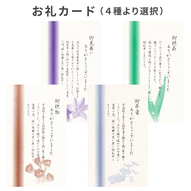 香典返し挨拶状 胡蝶蘭カード 家名と差出人名のみ印刷 文章の変更なし ゆうパケットで発送 送料無料 忌明け満中陰の返礼品に添えてご使用ください。 喪主・施主名のみの印刷でお手頃な価格で設定いたしました。 本文の変更や故人名などの追加印刷はできません。 葬儀後 49日 四十九日 法要 お返し 送料無料 (ご注文について) 文章を2種よりご選択ください。 お入れできるのは ・カード右下の家名 ・差出人のお名前 となります。 ご注文時に「原稿のご... 2,400円 税込 送料込 カードOK レビュー11件 帰蝶堂 挨拶状はがき印刷 ![]() | ||