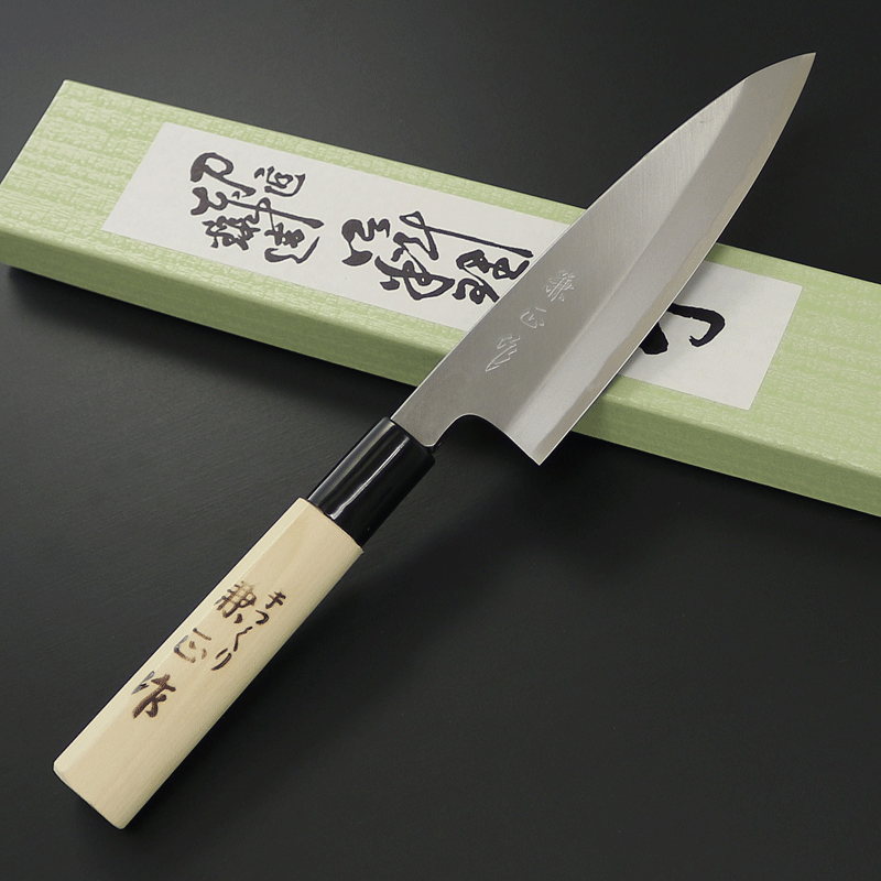 ◆SALE◆包丁全品値下げ中!! 木柄なのに防腐、防菌、防水効果!手になじみ易く、疲れにくい木柄に天然樹脂(食品添加物)を浸透させることにより、水の染み込みを抑え腐りにくく、雑菌の繁殖を防ぎます。刃には、モリブデン鋼とステンレスの複合材を使用していますので、錆びにくく、切れ味が良く耐摩耗性に優れています。『団十郎』シリーズの包丁一覧はこちらから★■サイズ:刃12cm、全長245mm■質量:105g■背厚:3.5mm■メーカー希望小売価格はメーカ... 10,010円 税込 送料別 カードOK 食器の通販 KYOEI ![]() | ||