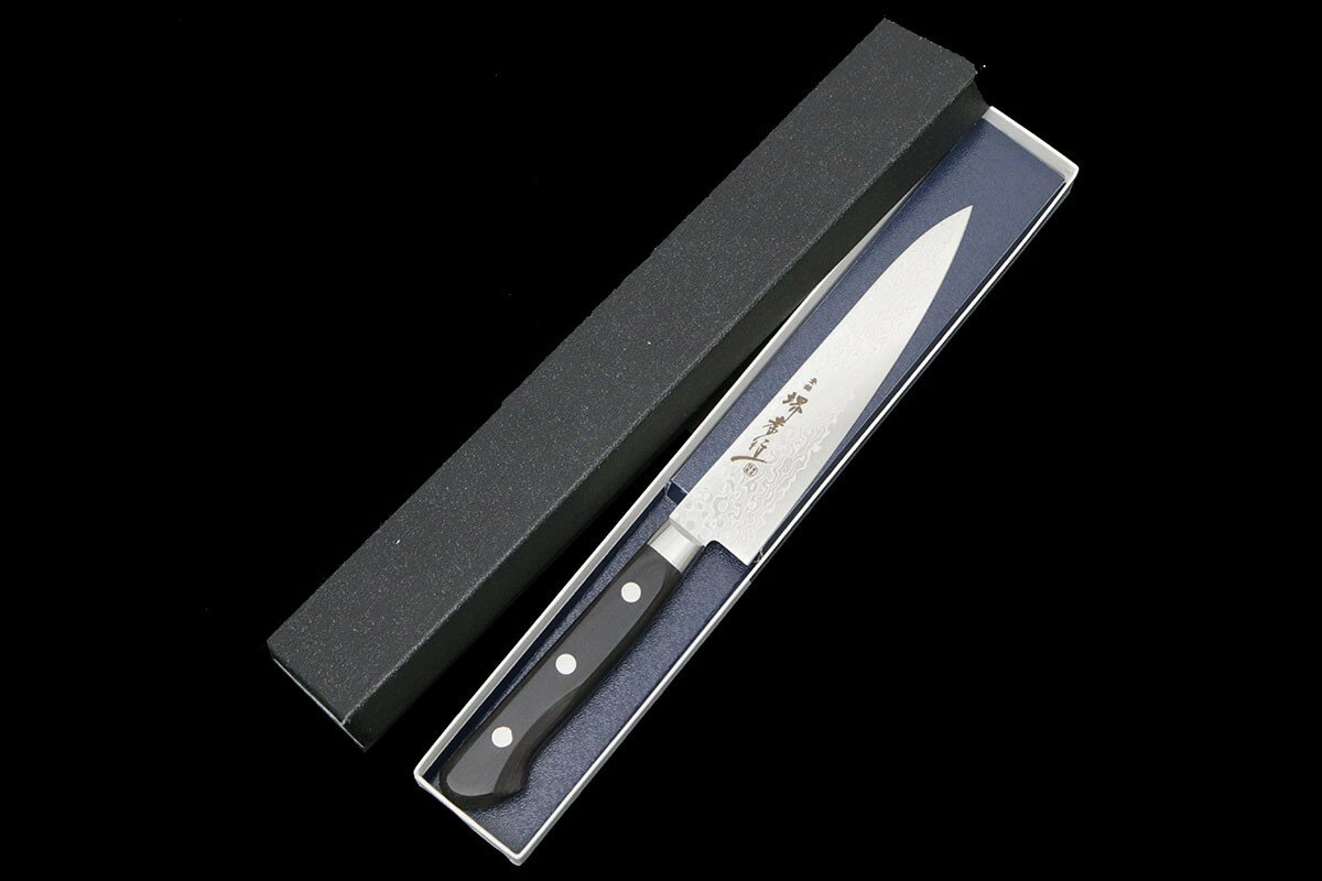 ■ ラッピング・送料無料! ■ 鎚目模様が特長の「37層鋼」。和の要素を感じさせながらも、伝統に寄りすぎない軽やかさと清潔感があるデザインで個性が際立ちます。刃の半分に厚みを持たせているので適度な重みがあり、かぼちゃなど硬い食材が切りやすく、切り離れもよい包丁です。 【商品の特徴】 ●芯材にはステンレス鋼でトップクラス、コバルト入りVG-10を採用 ●刃に厚みを残し、根菜類など硬い素材が切りやすい半すき仕様 ●和包丁で一般的な栗型形状ハンドルを進化させました ●左右どちらが利き手でも使いやすい左右対称デザインです ペティナイフについて フルーツなどにはもちろん、小回りがきくので忙しい朝のお弁当づくりや肉・魚を切ることにも使えます。 材質表示 刀身:37層鋼 芯材:VG-10 表面:鎚目 口金:316L ハンドル:積層強化木(黒) サイズ 刀身:約130mm 全長:約253mm 箱寸:270×65×20mm 重量 約100g 原産国 日本(岐阜県関市) 食洗機 × ※お使いになった後は刃先に注意をしながら水分をきれいに拭き取って収納してください。 「あすか」は研ぎ直し券は入っておりません。名入れサービスも行っておりません。予めご了承くださいますようお願い申し上げます。 ※画像はサンプルです。仕様変更がある場合がございます。 商品の色や質感を出来るだけ忠実に再現できるよう心掛けていますが、画面上の色はブラウザや設定により実物と若干異なる場合がございます。 ■ 熨斗をご希望の方 ■ 必ず【オレンジ(熨斗)】または【シルバー(熨斗)】をお選びください。確認事項が生じた場合は、当店からお客様にご連絡させて頂きます。お届けが遅れる場合がございますので、余裕をもってご注文いただきますようお願い申し上げます。オレンジ(リボンシール)、シルバー(リボンシール)をご選択の場合、熨斗の各項目をご選択されても熨斗対応は出来かねます。予めご了承くださいませ。 熨斗について詳しく見る ⇒ ■ ショッパーをご希望の方 ■ 包丁専用のショッパーです(1枚330円)※ショッパーは専用ページで販売しております。 ショッパーご購入の方はこちら ⇒ 14,300円 税込 送料込 カードOK ヤクセル・ダイレクト ![]() | ||