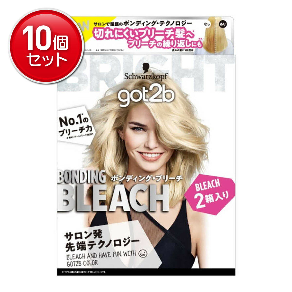 インナーカラーも簡単!指で塗れて垂れにくい! ■ ねらった部分にハイライト思い通りのデザインヘアを ●ポイントブリーチが簡単 指で塗るクリームタイプのブリーチだから、ねらった部分をブリーチしやすい! 様々なデザインヘアへの挑戦が可能に! ●使い分けできて便利 2包タイプだから、使用量を調節可能。 前髪だけ、耳まわりだけ、というニーズに対応! ■ 秘密はサロンで話題の「ボンディング・テクノロジー」 ●ボンディング・ブリーチ 毛髪保護成分「コハク酸」が毛髪内部まで浸透。 ハイトーンなのに、なめらかな仕上がりへ。 ●ボンディング・トリートメント ブリーチ後に使うトリートメント付き。毛髪保護・補修成分「塩化Mg」配合。毛髪内部に直接働きかけ、切れにくいブリーチ髪へ。 ■ got2b (ゴットゥービー) 【なりたい派手髪、自分でつくろう! 】 got2bは「派手髪」を楽しむブランドとして、欧米を中心に8カ国で展開中。 サロン・欧米のトレンドを取り入れ、日本でも「派手髪」を楽しむ文化を広げていきます。 商品名 ゴットゥービー ボンディング・ポイントブリーチ got2b BONDING POINTBLEACH ブランド got2b(ゴットゥービー) 内容量 1剤(パウダー):5g×2、2剤:40g、アフターブリーチトリートメント:15g×2 【3個セット】 商品コード J4987234390373 使用方法 【パッケージに入っている物】 1剤(パウダー)、2剤、手袋、アフターブリーチトリートメント、カップ、手袋、スティック、使用説明書、 ●使用量の目安:パウダー1包分で肩につくくらいの髪の長さの毛束6~10本分 【ご使用前に必ず使用説明書をよく読んで、正しくお使いください。】 1. カップに、2剤と1剤(パウダー)を入れ、スティックでよくかき混ぜます。 2. 混合した後すぐに、ブリーチしたい部分の毛束に混合クリームを指で塗り、10-30分放置します。 3. よくすすいでシャンプーをし、アフターブリーチトリートメントで仕上げます。 ※混合クリームやすすぎ湯が目に入らないようにご注意ください。 ●仕上がりの髪色は、ご使用前の髪色、髪の傷み具合、髪質、室内温度、放置時間によって異なります。 ●ヘアカラーなどで黒く染めた髪を明るくできません。 ●ヘアカラー、ブリーチ、パーマなどの繰り返しで著しく髪が傷んでいる場合は使用しないでください。 ●本品を使用後、再度ブリーチやヘアカラーをされる場合、髪や頭皮への負担を考え、1週間以上の間隔をおいてください。 使用上の注意 □ ご購入前・ご使用前にお読みください。 □ ご使用の際は使用説明書をよく読んで正しくお使いください。 □ 次の方は使用しないでください。 ・今までに本品に限らず過硫酸塩配合の製品でかぶれたことのある方 ・過硫酸塩配合の製品で、使用中又は直後にじんま疹(かゆみ、発疹、発赤)あるいは気分の悪さ(息苦しさ、めまい等)を経験したことのある方 ・頭皮あるいは皮膚が過敏な状態になっている方(病中、病後の回復期、生理時、妊娠中等) ・頭、顔、首筋に、はれもの、傷、皮膚病がある方 ・腎臓病、血液疾患等の既往症がある方 □ 薬剤や洗髪時の洗い液が目に入らないようにしてください。 □ 眉毛、まつ毛には使用しないでください。 □ 幼小児の手に届かない所に保管してください。 □ 高温や湿度の高い所、直射日光を避けて保管してください。 □ 頭髪以外には使用しないでください。 □ 幼小児には使用しないでください。 □ 混合液は、容器に入ったままで放置しないでください。ガスが発生し、容器が破裂したり、液があふれ出たりして周りを汚すおそれがあります。 □ 薬剤が目に入った場合は直ぐに洗い流してください。 □ 過硫酸塩配合の製品でかぶれたことのある方は絶対に使用しないでください。 □ 本品は過硫酸塩配合の製品で、アレルギー反応をおこすことがあります。 成分 [1剤]got2b ブリーチ パウダー:医薬部外品 [有効成分]:過硫酸アンモニウム、過硫酸カリウム、過硫酸ナトリウム [その他の成分]:エデト酸塩、グンジョウ、ケイ酸Na、重質炭酸Mg、ヒドロキシエチルセルロース、無水ケイ酸、無水メタケイ酸Na、流動パラフィン [2剤]クリームデベロパー P:医薬部外品 [有効成分]:過酸化水素水 [その他の成分]:流動パラフィン、PG、コハク酸、塩酸リジン、アルギニン、フェノキシエタノール、POEセトステアリルエーテル、セトステアリルアルコール、ヒドロキシエタンジホスホン酸液、ピロリン酸Na got2b ヘアトリートメント:化粧品 水、セテアリルアルコール、ジメチコン、炭酸ジカプリリル、ベヘントリモニウムクロリド、ジステアロイルエチルヒドロキシエチルモニウムメトサルフェート、 塩化Mg、ココジモニウムヒドロキシプロピル加水分解ケラチン(羊毛)、加水分解ケラチン(羊毛)、ステアラミドプロピルジメチルアミン、アモジメチコン、 ビスアミノPEG/PPG-41/3アミノエチルPG-プロピルジメチコン、クエン酸、乳酸、フェノキシエタノール、イソプロパノール、セトリモニウムクロリド、 メチルパラベン、ポリクオタ