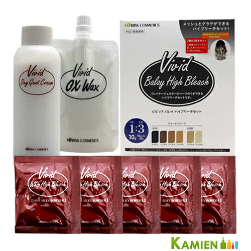※北海道、沖縄県への配送は納期情報プラス最短で7日後の出荷となります。※北海道、沖縄県への配送は日時指定はお受けできません。10034727商品詳細バレイヤージュカラーのベース作りができるハイブリーチセット「イリヤ ビビッド バレイ ハイブリーチセット」メッシュとグラデーションができるハイブリーチセット。高粘度のブリーチ剤と低粘度のブリーチ剤ができる2種類のオキシをセット。高粘度のブリーチ剤になる事で液ダレを防ぎ、スライスをとった毛束に集中的に塗布が可能。手で揉み込みながらのポイント使いにおすすめ。高粘度のブリーチ剤と低粘度のブリーチ剤ができる2種類のオキシを セット。高粘度のブリーチ剤になる事で液ダレを防ぎ、スライスをとった毛束に集中的に塗布が可能。手で揉み込みながらのポイント使いにおすすめ。放置時間により、仕上がりの明暗がコントロールできます。2種の2剤のどちらでも同等の明るさになります。※ご使用の際は箱裏面の使用上の注意をよく読んで正しくお使いください。【使用方法】グラデーションブリーチ1.ファインシルキーパウダー(1剤)とオキシジェントクリーム(2剤)を1:3の割合で付属のヘラを使って混合してください。2.明るくしたい部分から毛先にかけてブラシで十分な量を塗布してください。3.放置時間は5〜30分を目安にしてください。4.希望の明度まで脱色されたら、ぬるま湯でプレーンリンスし、シャンプーでしっかりと洗い流してください。※毛先の明るさが不足している場合は、再度1〜4を毛先中心に行ってください。※ダメージによる断毛や縮れには十分に注意してください。メッシュブリーチ1.ファインシルキーパウダー(1剤)とOXワックス(2剤)を1:3の割合で付属のヘラを使ってしっかりと混合してください。2.明るくしたい箇所の毛束を取り、毛束感を出すようなスタイリングをするイメージで塗布してください。(頭皮につかないよう根元をあけて塗布してください。)※指先などを使って塗布する場合は、ピッタリとフィットするプラスチック手袋などをご使用ください。3.放置時間は5〜30分を目安にしてください。4.希望の明度まで脱色されたら、ぬるま湯でプレーンリンスし、シャンプーでしっかりと洗い流してください。※ダメージによる断毛や縮れには十分に注意してください。内容量ファインシルキーパウダー:10g×5オキシジェンとクリーム:90mlOXワックス:60g主な配合成分ファインシルキーパウダー<有効成分>過硫酸アンモニウム、過硫酸カリウム<その他の成分>無水メタケイ酸Na、無水ケイ酸、CMC/Na、アクリル酸・メタクリル酸アルキル共重合体、ステアリン酸Mg、ラウリル硫酸塩、ジメチコン、水解シルク末、エデト酸塩、タルクオキシジェントクリーム<有効成分>過酸化水素水<その他の成分>ラウリルアルコール、ベヘニルアルコール、セタノール、POEセチルエーテル、ラウリル硫酸塩、常水、ヒドロキシエタンジホスホン酸液、リン酸、リン酸3Na、香料OXワックス<有効成分>過酸化水素水<その他の成分>マイクロクリスタリンワックス、カルナウバロウ、ポリエチレンワックス、ミツロウ、メドウフォーム油、デカメチルシクロペンタシロキサン、セトステアリルグルコシド、セトステアリルアルコール、POEセチルエーテル、セタノール、水解シルク液、オウバクエキス、ヒドロキシエタンジホスホン酸液、リン酸、リン酸3Na、常水発送詳細※別注文での同梱発送は行えませんので必ずご注文は1回におまとめ下さい。※海外発送は行っておりません。注意事項ご注文前に必ず当店メールアドレスの受信設定をお願いいたします。当店のメールアドレス:kamien@shop.rakuten.co.jp(受信設定が未設定の場合スムーズなお取引ができない可能性がございます)※当店の販売商品はお客様による転売を想定しておりません。※仕入先や仕入れ時期により、外装フィルムが巻かれていない 場合がございますが、100%新品未使用の正規品です。外装フィルムの一部が破れてしまっている場合もございますが、その様な理由での交換や返品は一切お断りしております。外装フィルムは商品の一部ではございません。※ご新規でのご注文の場合、必ずご注文前にショッピングガイド欄の 一読をお願いいたします。ご覧いただいております商品は、メーカー様のリニューアルに伴いパッケージ・香り・サイズ・成分などが予告なく変更される場合がございます。その為、掲載されている画像や詳細と異なる商品を、ご注文者様への許可なくお届けする場合も稀にございます。メーカー欠品または完売の際にはキャンセルをお願いすることがございます。なお、商品パッケージのご指定はお受けできませんのでご了承お願いいたします。広告文責株式会社 LDImail:kamien@shop.rakuten.co.jp美容関連品/化粧品/ヘアケア用品/スキンケア用品/ボディケア用品メーカー:イリヤ化学【あす楽_土曜営業】【あす楽_日曜営業】【あす楽_年中無休】[イリヤ化学] イリヤ ビビッド バレイ ハイ