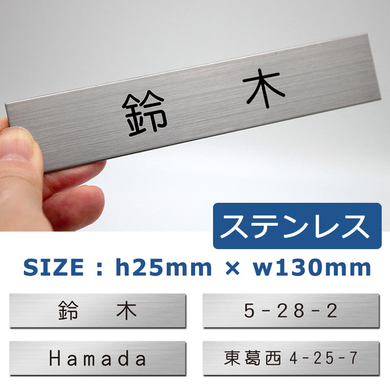 ![]() | その他のマンション表札 画像をクリック → 各商品ページへ ステンレス・銅 Wetエッチング ステンレス レーザーカット クリアプレート&ステンレス クリアプレート&アクリル アルミデザインプレート 1.6mm厚 2層板 0.5mm厚 2層板 アクリル切り文字 セラミックタイル 御影石 天然木 天然木オイルステン ステンレス&ステンレス■オーダーサイズで製作します。 ■厚さは0.8mm または 1.5mm より選択 ■材質:ステンレス ヘアライン仕上げ ■加工法:Dryエッチング ■耐水:○、耐紫外線:○、野ざらし:○ ■納期:原稿確認後10営業日以内に発送 ●面積100cm2以下で12文字までの価格です。13文字目より1文字につき550円(税込) 加算されます。英字は0.5字相当。イラストは2字相当。文字やイラストが小さいと製作できない場合があります。 ●面積が100cm2を超える場合は注文承諾時に加算金額をお知らせします。 使用例 使用例 ジャストサイズで製作出来ます ラインナップ 画像をクリック → 各商品ページへ ブラック 鏡面 ゴールド Dog&Cat 一戸建 おすすめポイント ●オーダーサイズだから取付安心 縦・横サイズは自由に指定できますので表札台にピッタリに収まります。 厚さは0.8mmまたは1.5mmよりお選び頂けます。 ●充実のオプションで取付安心 マグネット・両面テープ・磁石に付くステンレスプレート・厚さ調整板等、多数のオプションをご用意しました。取付シーンにあわせてご利用下さい。 ●ベース素材:ステンレス ヘアライン仕上げ ステンレスの中でも耐食性に優れ、幅広い用途で実績のある素材(SUS304)を使用していますので屋外使用もOKです。塗装とは違い薬液処理による化学発色のため太陽光にあたっても色あせせず、ヘアラインを生かした上品な仕上がりとなります。 ●着色方法:Dryエッチング+ウレタン塗装 着色前にはDryエッチングにより金属表面に微細な凹凸をつくり塗料の密着性を高めてから塗装します。塗料は自動車などにも使用される耐久性の高いウレタン塗料で塗装していますので屋外でも安心してご使用頂けます。塗装色はブラックです。 デザイン一覧 漢字書体一覧 英字書体一覧 イラスト一覧 オプション 両面テープ(平滑面用) 屋外耐候性に優れた強力な接着力をもつ両面テープです。(厚さ約1mm)取付面が平滑な面の場合に使用できます。平滑面でも水を通す素材(石等)には使用出来ません。ザラザラ面や凹凸のある場合は接着剤を使用して下さい。表札サイズの2分の1程度のテープを付属します。価格は220円:税込(面積100cm2以内)です。 マグネットシート 取付面が鉄などの磁石につく素材の場合に使用します。磁石にはくっつきません。表札サイズより若干小さく作ります。厚さは0.8mm。価格は550円:税込(面積100cm2以内)です。 磁石につくステンレスプレート 取付面に磁石が設置してある場合に使用します。表札サイズより若干小さく作ります。厚さは0.4mm。価格は¥1,100円:税込(面積100cm2以内)です。 厚み調整板 落し込みや差し込みタイプの取付でガタツキがでる場合に表札裏に貼り付けて厚さを調整します。表札サイズで作成します。厚さは0.5mm、1.5mm、2mmの3種類。価格は550円:税込(面積100cm2以内)です。 各種表札ユニットに対応しています 注文の流れ・入力の方法 7,700円 税込 送料別 カードOK レビュー52件 アート・マーク【表札の専門店】 ![]() | |