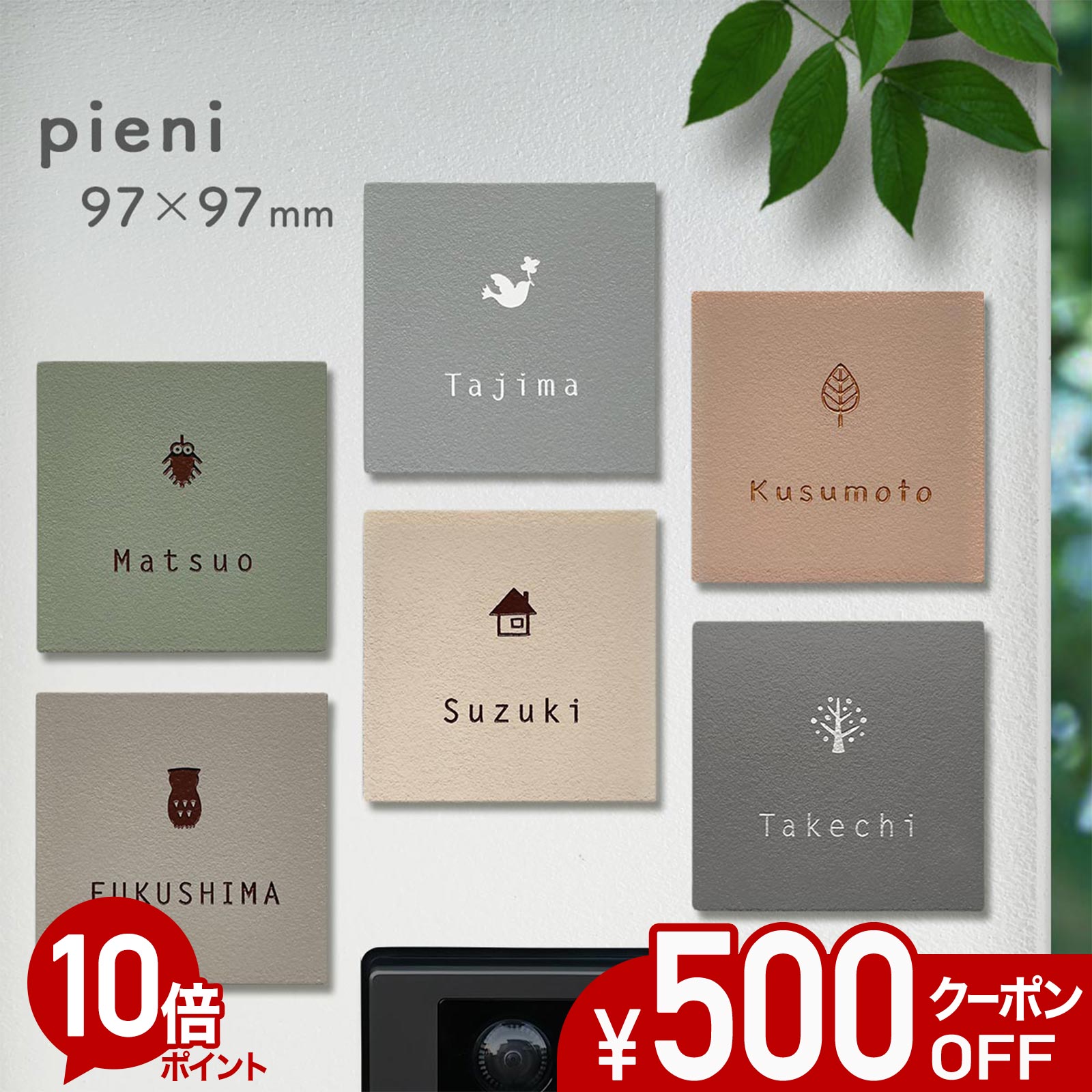 小さめタイル表札。門柱や玄関横の壁面など、今の戸建てにちょうどいいサイズのかわいい表札です。 商品詳細 サイズ 約W97×H97mm(サイズ変更不可) 厚み 約9mm 材質 セラミックタイル6色から選択 仕様 サンドブラスト(凹文字/文字彫り込み) レイアウト おまかせとなります※番地を追加できます。お名前の下に配置します。 書体 英文、和文の各2書体から選択 ワンポイント 8種類から選択 文字色 6色から選択 付属品 取付けキット(強力接着剤/厚手両面テープ) 取付方法 発送予定日 製作承認から10営業日以内に発送(土日祝のぞく) 表札|タイル表札|小さめ|戸建て|正方形|100角|鳥|ふくろう|ハリネズミ|みのむし|サンゴ|木|葉っぱ|リーフ|お家|ネームプレート|LIXIL|YKKap|宅配ポスト|パナソニック|三協アルミ|四国化成|福彫|ユニソン|機能門柱|門柱|ポスト|機能ポール|宅配ボックス|エントランスポール|玄関|二世帯|新築|中古|リフォーム|リノベーション|オリジナル|オーダーメイド|おしゃれ|かわいい|こだわり|など対応の表札をお探しの方におすすめです。 取付方法などの追加料金一覧 ご注文方法 よくある質問 ギフトについて小さめ正方形タイル表札 pieni 玄関横の壁面や、ポスト×宅配ボックス一体型門柱など、今の戸建てにちょうどいい小さめサイズのかわいい正方形タイル表札です。 表札|タイル表札|小さめ|戸建て|正方形|100角|鳥|ふくろう|ハリネズミ|みのむし|サンゴ|木|ツリー|葉っぱ|リーフ|お家|ネームプレート|LIXIL|YKKap|宅配ポスト|パナソニック|三協アルミ|四国化成|福彫|ユニソン|機能門柱|門柱|ポスト|機能ポール|宅配ボックス|エントランスポール|玄関|二世帯|新築|中古|リフォーム|リノベーション|オリジナル|オーダーメイド|おしゃれ|かわいい|こだわり|など対応の表札をお探しの方におすすめです。 制作例1 タイル色:チャコール 書体:A.レターゴシック 文字色:シルバーメタリック 人気のポスト×宅配ボックス一体型門柱にもちょうどいい小さめ表札です。 制作例2 タイル色:アイボリー 書体:B.チョークボード 文字色:コーヒーブラウン ふたつ並べて二世帯にもちょうどいいサイズです。 制作例3 タイル色:左.ピンクベージュ、右.アイスグレー 書体:A.レターゴシック 文字色:ホワイト チャコール×ゴールドで大人っぽい印象に。 制作例4 タイル色:チャコール 書体:A.レターゴシック 文字色:ゴールドメタリック(赤金) お客様より表札*の施工例をご紹介いただきました。(*楽天店以外での販売分も含みます) 表札自慢JT109 色やワンポイントもイメージ通りで、とても可愛く仕上げて頂きました。 タイル色:チャコールグレー 英文書体:B.チョークボード ワンポイント:お家 色入れ:ゴールドメタリック(赤) [参考]LIXIL 機能門柱 アクシィ1型 表札自慢JT108 (画像上段) イラスト、色、大きさ、可愛さ全て満足です!! タイル色:ピンクベージュ 英文書体:B.チョークボード ワンポイント:お家 色入れ:ホワイト 表札自慢JT103 (画像下段) シャイングレーの門柱に、ピンク色の表札がとてもかわいいです。あまり、表札を目立たせたくなかったので、この表札はとても控えめで、とても気に入りました。 タイル色:ピンクベージュ 英文書体:B.チョークボード ワンポイント:鳥 色入れ:ブロンズメタリック [参考]LIXIL 機能門柱 アクシィ1型 タイル色と文字色の組み合わせ次第で印象が変わります。 タイル色 玄関に馴染むアースカラーを揃えました。 書体/フォント シンプルでおしゃれなレターゴシックと、ポップでかわいいチョークボードの英文2種類をご用意しました。 また、漢字を希望されるお客さまの声にお応えして和文2種類も選べるようになりました。 ワンポイント 人気のフクロウや、ツリーなど玄関が明るくなるモチーフ8種類から選べます。 ※ワンポイントなし等のご要望は備考にご記入ください。 文字色 人気のベーシックカラーとおしゃれなメタリックカラー6色を揃えました。 タイルと文字色の組み合わせ一覧 ※文字色によっての文字の太さの印象が異なりますのでご了承ください。 メタリックカラーのほうが細く見え、ホワイトは太い印象になります。 サイズ 約W97×W97mm 人気の宅配ボックス一体型機能門柱やインターフォン周りにも使いやすい正方形です。 [参考]インターフォンサイズ:約W100×H130mm 取付方法 付属の取り付けセットなら、穴開けなしで簡単に取り付けできます。 ※凹凸のある面にはボルト出しもあります。 取り付けについてご不明な点があればお問合せください。設置面の写真を送っていただけるとスムーズです。 [付属品] ・厚手両面テープ(ミラーマット2mm) ・強力接着剤セメダインスーパーX2(10ml) 取付方法 タイル表札の追加オプション 梱包と発送方法 動かないようにガッチリ固定した安心の梱包でお届けします。 ご確認ください ※イメージ画が確認できない場合はご連絡ください。※お急ぎの場合はご相談ください。 7,700円 税込 送料込 カードOK レビュー3件 表札オンリーワン ![]() | ||