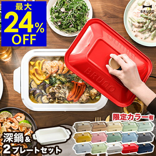 BRUNO コンパクトホットプレートセラミックコート鍋セット たこ焼きや鍋料理も楽しめる ホットプレートセット ホーロー鍋をイメージしたスタイリッシュなデザインと使いやすさで大人気の『 BRUNO コンパクトホットプレート セラミックコート鍋セット 』。基本の平面プレート・たこ焼きプレートに深鍋を加えた、多彩な調理が楽しめるセットです。定番のお好み焼きや餃子、パンケーキはもちろん、おでんやすき焼きなどの煮込み料理まで大活躍。焼肉もしっかり焼ける最大250℃のハイパワーで、毎日の調理からおうちパーティまで幅広いシーンに◎。食卓を華やかに彩るキッチン家電です。 メーカー希望小売価格はメーカーサイトに基づいて掲載しています スペック 品名 BRUNO COMPACT HOTPLATE ブルーノ コンパクトホットプレート セラミックコート鍋セット サイズ 本体:約 幅 375mm×奥行き 235mm×高さ 140mm 平面プレート:約 幅 300mm×奥行き 204mm×高さ 35mm たこ焼きプレート:約 幅 300mm×奥行き 204mm×高さ 30mm、穴直径:約 42mm セラミックコート鍋:約 幅 405mm×奥行き 242mm×高さ 70mm ※たこ焼き穴直径のみ当店調べ 重さ 平面プレート+フタ使用時 / たこ焼きプレート使用時:各 約 2.3kg セラミックコート鍋:約 980g 素材 本体 / フタ:スチール、フェノール樹脂等 プレート:アルミニウム合金( 内側表面ふっ素樹脂加工 ) セラミックコート鍋:アルミニウム合金( 内側表面セラミックコート )、フェノール樹脂、ステンレススチール コードの長さ 約 1.8m 電源 AC100V 50/60Hz 消費電力 1200W 機能 ・温度調節:約 65〜250℃( 無段階 ) ・サーモスタット ・温度ヒューズ( 240℃ ) ・マグネット式脱着電源コード 保証期間 メーカー保証1年 付属品 木べら、電源コード、取扱説明書( 保証書含む ) お手入れ [ 水洗いできるもの ] フタ、各種プレート、セラミックコート鍋、木べら ・食器洗浄乾燥機には対応していません。 ・磨き粉、たわし、シンナー、ベンジンなどは使用しないでください。 ・本体は拭き掃除でお手入れしてください。 備考 ・たこ焼きプレートは1度に24個のたこ焼きが焼けます。 ・たこ焼きプレートで調理する際、フタは使えません。 ・金属製のへらや串、ナイフなどは使用しないでください。 ・トマトなどのように色染みの付きやすい食材や、キムチなどのように濃い色で塩分や酸性の強い食材は、フタに色染みが生じる場合があります。付着した場合はすぐに拭き取ってください。 ・プレートの底面に突起がありますので、取扱いには十分ご注意ください。 ご注意点 ※製品仕様やパッケージは改良のため予告なく変更される場合があります。 ※サイズや色味は個体により若干の差異が生じることがあります。 ※商品の色は、画面上の画像と実物とでは多少異なる場合があります。あらかじめご了承のうえ、お買い求めください。 ※電源は日本国内の交流100Vを使用し、定格15V以上のコンセントを単独で使用してください。 ※はじめて使用する際にプレートやヒーターからにおいや煙が出ることがありますが、故障ではありません。 ※不安定な場所、水で濡れた場所、壁や家具のそば、プラスチックなど熱で変形するもののそば、ビニール系素材や熱に弱い敷物の上、小さなお子さまが触れる場所での使用や保管はしないでください。 ※購入間違いによる返品・交換はお受けいたしかねます。ご注文の前に種類やカラーを十分ご確認ください。キッチン家電>ホットプレート・グリル・フライヤー>ホットプレート 部門2025年3月4日(火)更新 (集計日:3月3日) BRUNO ブルーノ コンパクトホットプレートセラミックコート鍋セット BOE021 たこ焼きや鍋料理も楽しめるホットプレートセット ホーロー鍋をイメージしたスタイリッシュなデザインと使いやすさで大人気の『 BRUNO コンパクトホットプレート セラミックコート鍋セット 』。基本の平面プレート・たこ焼きプレートに深鍋を加えた、多彩な調理が楽しめるセットです。定番のお好み焼きや餃子、パンケーキはもちろん、おでんやすき焼きなどの煮込み料理まで大活躍。焼肉もしっかり焼ける最大250℃のハイパワーで、毎日の調理からおうちパーティまで幅広いシーンに◎。食卓を華やかに彩るキッチン家電です。 セラミックコート鍋セット ・本体 ・平面プレート ・たこ焼きプレート ・セラミックコート鍋 Point 食卓になじむ琺瑯調デザイン 鋳物の琺瑯鍋をイメージした、出しっぱなしでも絵になるインテリア家電。従来のホットプレートのイメージを払拭したコンパクトさで、毎日の調理からホームパーティーなど特別なシーンまで幅広く活躍します。 2〜3人用にちょうどいい 2〜3人分の調理に適した、A4サイズよりひとまわり大きい程度のコンパクトサイズ。食卓にも収まりがよく、しまうときも収納スペースを圧迫しないのが嬉しいポイント。一人暮らしの方にもおすすめです。 Point 料理の幅が広がるプレート フラットで使い勝手多彩な「 平面プレート 」と、1度に24個焼ける「 たこ焼きプレート 」