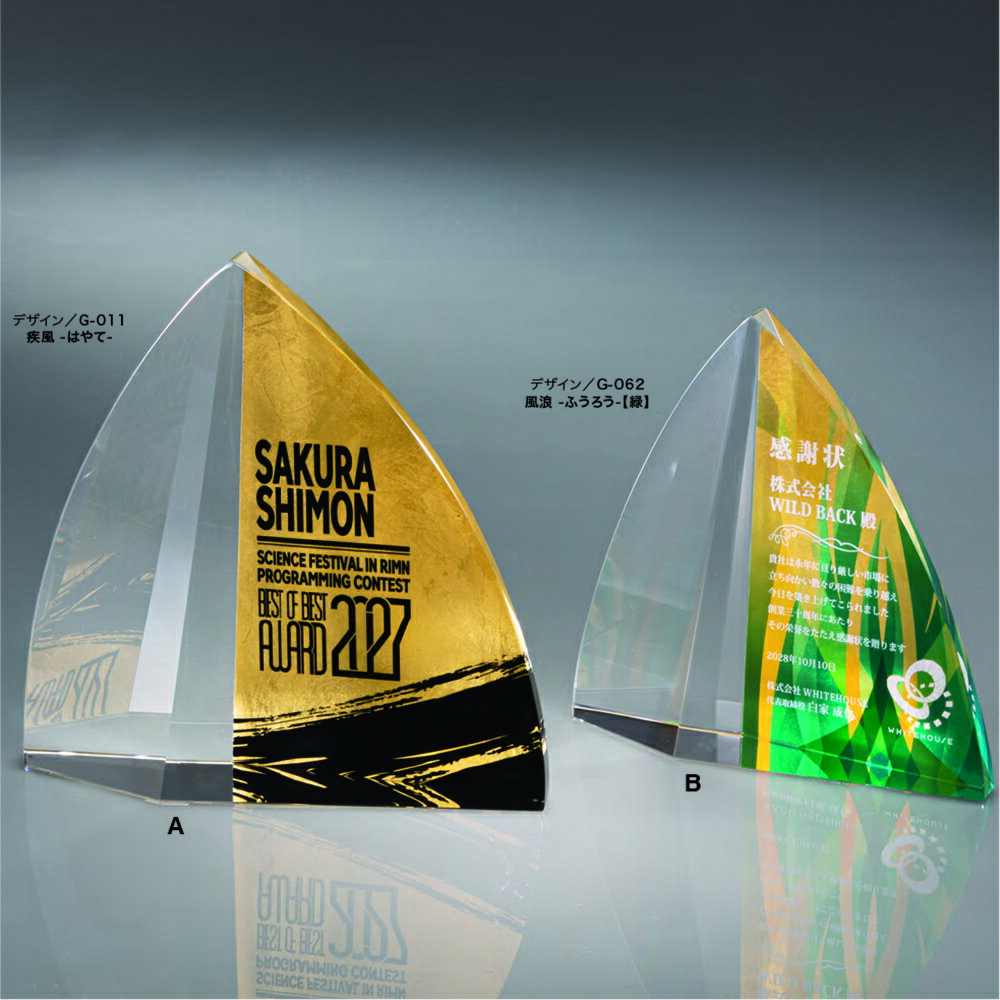 ひとつひとつを職人が丹精込めて作り上げる、金箔仕上げのスペシャルなトロフィー。 精微なカット加工で帆を表現。 ヨットのように進み続けるあなたに。 ※デザイン料・加工料【全て込みの価格】です。光学ガラス / 金箔A 高さ 210mm / 横 210mm / 奥行き 50mm / 重さ 1.97kg B 高さ 180mm / 横 180mm / 奥行き 45mm / 重さ 1.21kgガラス背面にダイレクト印刷加工 / 金箔全面貼り仕上げ... 68,200円 税込 送料別 カードOK トロフィー生活(立川徽章) ![]() | ||