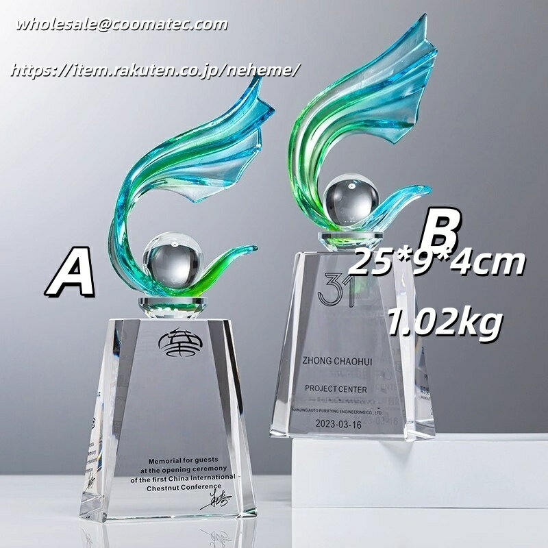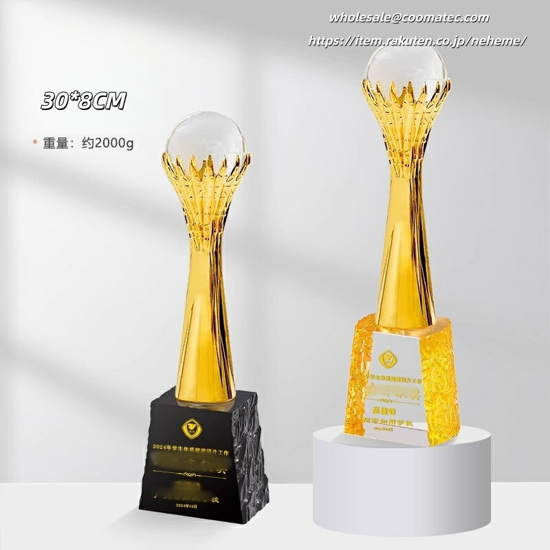 トロフィーの豊富なラインナップはこちらで随時更新中です。お気に入りが見つからない場合は、お手持ちの画像を頂ければ代わりにお探しします! 【価格について】 どのトロフィーも価格は相談可能ですので、どうぞご安心ください。 【ご注文の流れ】 注文 注文備考欄に用途や彫刻したい文字をご入力ください。デザインのご要望などもあればご記載ください。 デザイン資料の送付 オリジナルデザインや彫刻したいロゴ・写真がある場合は、注文確認メールに添付してご返信ください。 デザインの確認/修正 メールでやり取りしながら、ご希望に合わせて適宜修正し原稿を作成します。 納品・発送 原稿確定後、1週間を目安に発送いたします。 【具体的な手順】 彫刻したい内容をお問い合わせフォームまたはメール(wholesale@coomatec.com)でお送りください。 お客様のご希望に沿ってデザインを作成し、修正があれば最終案が決まるまで何度でも対応いたします。 また、編集可能なPDFをお渡しすることも可能です。ご自身でデザイン済みのデータがあれば、そのまま彫刻することもできます。 【彫刻について】 ロゴ・文字の彫刻は無料です。ロゴをご提供の場合は、高解像度のベクターデータ(AI, EPS, PDF等)をご準備ください。 【不良品・破損について】 トロフィーは壊れやすい製品のため、万一お受け取り後に破損等の問題がございましたら、すぐにご連絡ください。無料で新品をお送りします。 破損品は返品不要で、お客様の方で処分していただいて結構です。 配送について デザインが確定後、1週間以内に完成品をお届けいたします。国内配送は配送料無料で、丁寧に包装して発送いたします。 商品情報 おすすめ 【各種記念】 創業記念 入園記念 入学記念 卒業記念 叙勲記念 初詣・参拝記念 成人式記念 発表会・展示会記念 設立記念 受賞記念 ホールインワン記念 敬老記念 海外旅行記念 落成記念 【各種表彰】各種表彰業績表彰 優良販売店表彰 安全運転表彰 善行表彰 名誉(市民)表彰 七夕飾付コンクール 新製品コンクール 永年勤続表彰 功労功績表彰 技能表彰 改善提案表彰 協力事業所表彰 ディスプレ−・コンテスト 販売コンクール 【各種祝事】結婚祝 入社祝 賀寿祝 快気祝 成人祝 入学祝 誕生祝 新築祝 栄転祝 卒業祝 【各種功労賞】功績賞 協力賞 皆勤賞 優秀社員賞 提案賞 目標突破賞 生産達成賞 善行賞 奨励賞 名誉○○賞 永年勤続賞 功労賞 精勤賞 勤続○○年賞 優秀従業員賞 目標達成賞 無事故賞 卓越賞 遂行賞 知事賞 【共通賞名一覧】大臣賞 市長賞 会頭賞 理事長賞 町長賞 議長賞 委員長賞 支局長賞 社長賞 常務賞 課長賞 勝利○○賞 最優秀○○賞 月間賞 大関 小結 十両 敢闘賞 ハッスル賞 ファインプレー賞 ラッキー賞 団体賞 努力賞 特別賞 総監賞 頭取賞 区長賞 村長賞 組長賞 局長賞 会長賞 専務賞 部長賞 ○○新聞社賞 総合○○位 年間賞 横綱 関脇 前頭 殊勲賞 技能賞 フェアプレー賞 ドンジリ賞 応援賞 記録賞 新人賞 参加賞 特選特賞、入選入賞、佳作企画賞、アイデア賞、演技賞、熱演賞、残念賞、大衆賞、ユーモア賞、歌唱賞、作者賞、作詞賞、作曲賞、作品賞、主演賞、助演賞、新作賞、秀作賞、考案賞、発明賞、○○女王、ズバリ賞、ミス○○ 【文化行事】写真コンクール、絵画コンクール、音楽コンクール、書道大会、珠算大会、発明展、カルタ大会、川柳・俳句・短歌大会 【レジャー関係】ビーチカーニバル、美人コンテスト、梅まつり、詩吟大会、民謡大会、雪まつり、桜まつり、夏まつり会 【ご注文の流れ】 【オーダーメイドトロフィー制作の流れ】 1. 商品ご注文 まずは商品をお選びいただき、刻印したい内容(文字またはロゴ)をご指定ください。 ※刻印サービスは無料で承っております。 2. デザイン案作成 お客様からお預かりした内容をもとに、専任デザイナーがトロフィーのデザイン案を作成いたします。 3. デザイン確認 作成したデザイン案をお客様にご確認いただき、ご要望や修正点がございましたらお知らせください。 4. デザイン調整 お客様のご要望に沿ってデザインを修正いたします。 納得いただけるまで何度でも調整可能です。 5. 制作開始 最終デザインのご承認をいただきましたら、職人がクリスタルトロフィーの制作に取り掛かります。 このクリスタルトロフィーは、技術コンテストやホビーイベント、パーティーなど多様なシーンで活用できる賞品です。無料で文字彫刻が可能で、賞名や個人名、日付、主催者名などを刻むことができます。さらに、ロゴマークやメッセージの彫刻も追加料金なしで対応可能です。完成イメージをPDFデータで確認できるため、安心してオーダーいただけます。特別なイベントをより記念すべきものにするための最適な選択です。トロフィーの豊富なラインナップはこちらで随時更新中です。お気に入りが見つからない場合は、お手持ちの画像を頂ければ代わりにお探しします! 【価格について】 どのトロフィーも価格は相談可能ですの