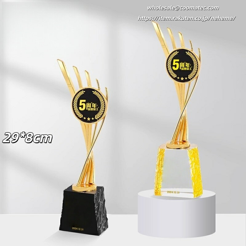 トロフィーの豊富なラインナップはこちらで随時更新中です。お気に入りが見つからない場合は、お手持ちの画像を頂ければ代わりにお探しします! 【価格について】 どのトロフィーも価格は相談可能ですので、どうぞご安心ください。 【ご注文の流れ】 注文 注文備考欄に用途や彫刻したい文字をご入力ください。デザインのご要望などもあればご記載ください。 デザイン資料の送付 オリジナルデザインや彫刻したいロゴ・写真がある場合は、注文確認メールに添付してご返信ください。 デザインの確認/修正 メールでやり取りしながら、ご希望に合わせて適宜修正し原稿を作成します。 納品・発送 原稿確定後、1週間を目安に発送いたします。 【具体的な手順】 彫刻したい内容をお問い合わせフォームまたはメール(wholesale@coomatec.com)でお送りください。 お客様のご希望に沿ってデザインを作成し、修正があれば最終案が決まるまで何度でも対応いたします。 また、編集可能なPDFをお渡しすることも可能です。ご自身でデザイン済みのデータがあれば、そのまま彫刻することもできます。 【彫刻について】 ロゴ・文字の彫刻は無料です。ロゴをご提供の場合は、高解像度のベクターデータ(AI, EPS, PDF等)をご準備ください。 【不良品・破損について】 トロフィーは壊れやすい製品のため、万一お受け取り後に破損等の問題がございましたら、すぐにご連絡ください。無料で新品をお送りします。 破損品は返品不要で、お客様の方で処分していただいて結構です。 配送について デザインが確定後、1週間以内に完成品をお届けいたします。国内配送は配送料無料で、丁寧に包装して発送いたします。 商品情報 おすすめ 【各種記念】 創業記念 入園記念 入学記念 卒業記念 叙勲記念 初詣・参拝記念 成人式記念 発表会・展示会記念 設立記念 受賞記念 ホールインワン記念 敬老記念 海外旅行記念 落成記念 【各種表彰】各種表彰業績表彰 優良販売店表彰 安全運転表彰 善行表彰 名誉(市民)表彰 七夕飾付コンクール 新製品コンクール 永年勤続表彰 功労功績表彰 技能表彰 改善提案表彰 協力事業所表彰 ディスプレ−・コンテスト 販売コンクール 【各種祝事】結婚祝 入社祝 賀寿祝 快気祝 成人祝 入学祝 誕生祝 新築祝 栄転祝 卒業祝 【各種功労賞】功績賞 協力賞 皆勤賞 優秀社員賞 提案賞 目標突破賞 生産達成賞 善行賞 奨励賞 名誉○○賞 永年勤続賞 功労賞 精勤賞 勤続○○年賞 優秀従業員賞 目標達成賞 無事故賞 卓越賞 遂行賞 知事賞 【共通賞名一覧】大臣賞 市長賞 会頭賞 理事長賞 町長賞 議長賞 委員長賞 支局長賞 社長賞 常務賞 課長賞 勝利○○賞 最優秀○○賞 月間賞 大関 小結 十両 敢闘賞 ハッスル賞 ファインプレー賞 ラッキー賞 団体賞 努力賞 特別賞 総監賞 頭取賞 区長賞 村長賞 組長賞 局長賞 会長賞 専務賞 部長賞 ○○新聞社賞 総合○○位 年間賞 横綱 関脇 前頭 殊勲賞 技能賞 フェアプレー賞 ドンジリ賞 応援賞 記録賞 新人賞 参加賞 特選特賞、入選入賞、佳作企画賞、アイデア賞、演技賞、熱演賞、残念賞、大衆賞、ユーモア賞、歌唱賞、作者賞、作詞賞、作曲賞、作品賞、主演賞、助演賞、新作賞、秀作賞、考案賞、発明賞、○○女王、ズバリ賞、ミス○○ 【文化行事】写真コンクール、絵画コンクール、音楽コンクール、書道大会、珠算大会、発明展、カルタ大会、川柳・俳句・短歌大会 【レジャー関係】ビーチカーニバル、美人コンテスト、梅まつり、詩吟大会、民謡大会、雪まつり、桜まつり、夏まつり会 【ご注文の流れ】 【オーダーメイドトロフィー制作の流れ】 1. 商品ご注文 まずは商品をお選びいただき、刻印したい内容(文字またはロゴ)をご指定ください。 ※刻印サービスは無料で承っております。 2. デザイン案作成 お客様からお預かりした内容をもとに、専任デザイナーがトロフィーのデザイン案を作成いたします。 3. デザイン確認 作成したデザイン案をお客様にご確認いただき、ご要望や修正点がございましたらお知らせください。 4. デザイン調整 お客様のご要望に沿ってデザインを修正いたします。 納得いただけるまで何度でも調整可能です。 5. 制作開始 最終デザインのご承認をいただきましたら、職人がクリスタルトロフィーの制作に取り掛かります。 このクリスタルトロフィーは、技術コンテストやホビーイベント、パーティーなど多様なシーンで活用できる賞品です。無料で文字彫刻が可能で、賞名や個人名、日付、主催者名などを刻むことができます。さらに、ロゴマークやメッセージの彫刻も追加料金なしで対応可能です。完成イメージをPDFデータで確認できるため、安心してオーダーいただけます。特別なイベントをより記念すべきものにするための最適な選択です。トロフィーの豊富なラインナップはこちらで随時更新中です。お気に入りが見つからない場合は、お手持ちの画像を頂ければ代わりにお探しします! 【価格について】 どのトロフィーも価格は相談可能ですの