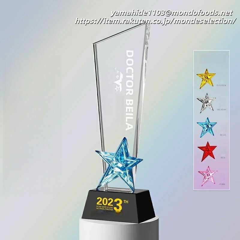 トロフィーの豊富なラインナップはこちらで随時更新中です。お気に入りが見つからない場合は、お手持ちの画像を頂ければ代わりにお探しします! 【価格について】 どのトロフィーも価格は相談可能ですので、どうぞご安心ください。 【ご注文の流れ】 注文 注文備考欄に用途や彫刻したい文字をご入力ください。デザインのご要望などもあればご記載ください。 デザイン資料の送付 オリジナルデザインや彫刻したいロゴ・写真がある場合は、注文確認メールに添付してご返信ください。 デザインの確認/修正 メールでやり取りしながら、ご希望に合わせて適宜修正し原稿を作成します。 納品・発送 原稿確定後、1週間を目安に発送いたします。 【具体的な手順】 彫刻したい内容をお問い合わせフォームまたはメール(wholesale@coomatec.com)でお送りください。 お客様のご希望に沿ってデザインを作成し、修正があれば最終案が決まるまで何度でも対応いたします。 また、編集可能なPDFをお渡しすることも可能です。ご自身でデザイン済みのデータがあれば、そのまま彫刻することもできます。 【彫刻について】 ロゴ・文字の彫刻は無料です。ロゴをご提供の場合は、高解像度のベクターデータ(AI, EPS, PDF等)をご準備ください。 【不良品・破損について】 トロフィーは壊れやすい製品のため、万一お受け取り後に破損等の問題がございましたら、すぐにご連絡ください。無料で新品をお送りします。 破損品は返品不要で、お客様の方で処分していただいて結構です。 配送について デザインが確定後、1週間以内に完成品をお届けいたします。国内配送は配送料無料で、丁寧に包装して発送いたします。 商品情報 おすすめ 【各種記念】 創業記念 入園記念 入学記念 卒業記念 叙勲記念 初詣・参拝記念 成人式記念 発表会・展示会記念 設立記念 受賞記念 ホールインワン記念 敬老記念 海外旅行記念 落成記念 【各種表彰】各種表彰業績表彰 優良販売店表彰 安全運転表彰 善行表彰 名誉(市民)表彰 七夕飾付コンクール 新製品コンクール 永年勤続表彰 功労功績表彰 技能表彰 改善提案表彰 協力事業所表彰 ディスプレ−・コンテスト 販売コンクール 【各種祝事】結婚祝 入社祝 賀寿祝 快気祝 成人祝 入学祝 誕生祝 新築祝 栄転祝 卒業祝 【各種功労賞】功績賞 協力賞 皆勤賞 優秀社員賞 提案賞 目標突破賞 生産達成賞 善行賞 奨励賞 名誉○○賞 永年勤続賞 功労賞 精勤賞 勤続○○年賞 優秀従業員賞 目標達成賞 無事故賞 卓越賞 遂行賞 知事賞 【共通賞名一覧】大臣賞 市長賞 会頭賞 理事長賞 町長賞 議長賞 委員長賞 支局長賞 社長賞 常務賞 課長賞 勝利○○賞 最優秀○○賞 月間賞 大関 小結 十両 敢闘賞 ハッスル賞 ファインプレー賞 ラッキー賞 団体賞 努力賞 特別賞 総監賞 頭取賞 区長賞 村長賞 組長賞 局長賞 会長賞 専務賞 部長賞 ○○新聞社賞 総合○○位 年間賞 横綱 関脇 前頭 殊勲賞 技能賞 フェアプレー賞 ドンジリ賞 応援賞 記録賞 新人賞 参加賞 特選特賞、入選入賞、佳作企画賞、アイデア賞、演技賞、熱演賞、残念賞、大衆賞、ユーモア賞、歌唱賞、作者賞、作詞賞、作曲賞、作品賞、主演賞、助演賞、新作賞、秀作賞、考案賞、発明賞、○○女王、ズバリ賞、ミス○○ 【文化行事】写真コンクール、絵画コンクール、音楽コンクール、書道大会、珠算大会、発明展、カルタ大会、川柳・俳句・短歌大会 【レジャー関係】ビーチカーニバル、美人コンテスト、梅まつり、詩吟大会、民謡大会、雪まつり、桜まつり、夏まつり会 【ご注文の流れ】 【オーダーメイドトロフィー制作の流れ】 1. 商品ご注文 まずは商品をお選びいただき、刻印したい内容(文字またはロゴ)をご指定ください。 ※刻印サービスは無料で承っております。 2. デザイン案作成 お客様からお預かりした内容をもとに、専任デザイナーがトロフィーのデザイン案を作成いたします。 3. デザイン確認 作成したデザイン案をお客様にご確認いただき、ご要望や修正点がございましたらお知らせください。 4. デザイン調整 お客様のご要望に沿ってデザインを修正いたします。 納得いただけるまで何度でも調整可能です。 5. 制作開始 最終デザインのご承認をいただきましたら、職人がクリスタルトロフィーの制作に取り掛かります。 このクリスタルトロフィーは、技術コンテストやホビーイベント、パーティーなど多様なシーンで活用できる賞品です。無料で文字彫刻が可能で、賞名や個人名、日付、主催者名などを刻むことができます。さらに、ロゴマークやメッセージの彫刻も追加料金なしで対応可能です。完成イメージをPDFデータで確認できるため、安心してオーダーいただけます。特別なイベントをより記念すべきものにするための最適な選択です。トロフィーの豊富なラインナップはこちらで随時更新中です。お気に入りが見つからない場合は、お手持ちの画像を頂ければ代わりにお探しします! 【価格について】 どのトロフィーも価格は相談可能ですの