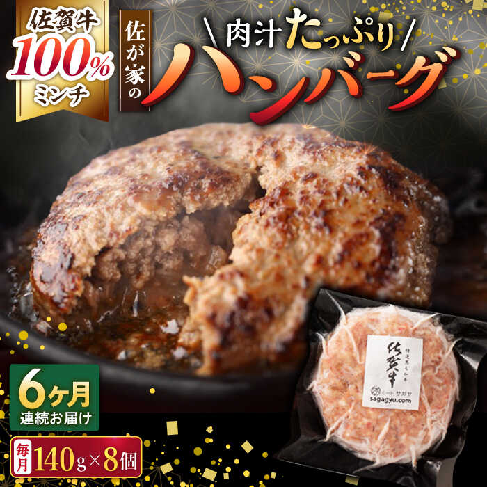 【佐賀牛ハンバーグを塩で食す】 ミンチには、佐賀牛を100%使用。当店が考えるハンバーグに1番適した部位をミンチにし、ブレンドしました。 味付けは甘みがしっかり出るまでローストした玉ねぎと、塩・胡椒のみで、佐賀牛の旨みを十分にご堪能いただけます。 柔らかいハンバーグから溢れ出す肉汁は、黒毛和牛ならではの旨味、そして佐賀牛の上質な脂の甘味が凝縮されています。 ジューシーで旨みたっぷり。佐が家オリジナルのハンバーグを是非ご賞味ください。 徹底的な衛生管理と、品質、味にこだわった、佐が家自慢・最高級の佐賀牛ハンバーグ。 良い品質の肉は、そのままで十分美味しいもの。 ミンチには、柔らかい口溶けを表現する小さ目の挽肉と、肉の食感を楽しめる大き目の挽肉をブレンドしています。 余計な調味料でごまかさず、塩・胡椒のみで味付けした佐賀牛ハンバーグは、「佐賀牛の美味しさを贅沢に、そのまま味わってほしい」という思いで出来上がった商品です。シンプルな味付けですので、佐賀牛本来の味と香りにきっとご満足いただけます。 フライパンに残った肉汁をソース代わりにして、またはシンプルにお塩で、お召し上がり下さい。 全国の催事会場や店舗にて大人気の逸品です。 ■全国トップクラスのブランド牛・佐賀牛 佐賀牛は、日本でもトップクラスの品質を誇るブランド牛。日本食肉格付協会の格付けを用いた呼称制度で、仙台牛に次ぐ全国2番目の厳しさを誇っています。 佐賀の穏やかな気候、良質な水、澄み切った空気の中で健やかに育った柔らかい赤身に風味ただようキメ細かい脂肪(サシ)が入った、見た目にも美しい佐賀牛。当店が長年契約している生産者さんは、子牛のうちから特別の愛情と、熟練した飼育技術をもって、ストレスがかからないようきめ細やかな気配りをし、一頭一頭丁寧に育てています。 機械で飼料を与える生産者が増える中、独自の餌の配合を行い、手作業で飼料を与えるという手間ひまを惜しみません。一頭一頭体調管理をおこない、独自の育成プログラムと自然豊かな地域の湧き水で育てられています。 下記内容を1ヶ月に1回、計6回お届けします。 ・佐賀牛ハンバーグ140g×8個 【賞味期限】製造より80日以内 【原料原産地】 佐賀県産 【加工地】 佐賀県武雄市 黒毛和牛 牛 牛肉 肉 和牛 牛肉ハンバーグ 個包装 小分け 佐賀県産 国産 地場産品基準該当理由 佐賀牛を原料とした加工品であり、仕入れから加工等、完成品までの全工程を、市内の工場で行っている。【佐賀牛ハンバーグを塩で食す】 ミンチには、佐賀牛を100%使用。当店が考えるハンバーグに1番適した部位をミンチにし、ブレンドしました。 味付けは甘みがしっかり出るまでローストした玉ねぎと、塩・胡椒のみで、佐賀牛の旨みを十分にご堪能いただけます。 柔らかいハンバーグから溢れ出す肉汁は、黒毛和牛ならではの旨味、そして佐賀牛の上質な脂の甘味が凝縮されています。 ジューシーで旨みたっぷり。佐が家オリジナルのハンバーグを是非ご賞味ください。 徹底的な衛生管理と、品質、味にこだわった、佐が家自慢・最高級の佐賀牛ハンバーグ。 良い品質の肉は、そのままで十分美味しいもの。 ミンチには、柔らかい口溶けを表現する小さ目の挽肉と、肉の食感を楽しめる大き目の挽肉をブレンドしています。 余計な調味料でごまかさず、塩・胡椒のみで味付けした佐賀牛ハンバーグは、「佐賀牛の美味しさを贅沢に、そのまま味わってほしい」という思いで出来上がった商品です。シンプルな味付けですので、佐賀牛本来の味と香りにきっとご満足いただけます。 フライパンに残った肉汁をソース代わりにして、またはシンプルにお塩で、お召し上がり下さい。 全国の催事会場や店舗にて大人気の逸品です。 ■全国トップクラスのブランド牛・佐賀牛 佐賀牛は、日本でもトップクラスの品質を誇るブランド牛。日本食肉格付協会の格付けを用いた呼称制度で、仙台牛に次ぐ全国2番目の厳しさを誇っています。 佐賀の穏やかな気候、良質な水、澄み切った空気の中で健やかに育った柔らかい赤身に風味ただようキメ細かい脂肪(サシ)が入った、見た目にも美しい佐賀牛。当店が長年契約している生産者さんは、子牛のうちから特別の愛情と、熟練した飼育技術をもって、ストレスがかからないようきめ細やかな気配りをし、一頭一頭丁寧に育てています。 機械で飼料を与える生産者が増える中、独自の餌の配合を行い、手作業で飼料を与えるという手間ひまを惜しみません。一頭一頭体調管理をおこない、独自の育成プログラムと自然豊かな地域の湧き水で育てられています。 【ハンバーグの解凍方法】 冷蔵庫内で半日程度かけて、ゆっくり解凍して焼いてください。袋からスルッとハンバーグが取り出せます。 ※流水や常温での解凍は、溶けすぎてしまう可能性がございますのでお控えください。 また、解凍し過ぎが原因で肉が袋にくっついて上手く取り出せ