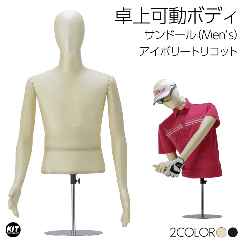 省スペースでもインパクト大!ディスプレイ効果を最大限に高める“動き”のある上半身のみの卓上サンドール。 商品のすぐそばに設置できるコンパクトサイズで、手に取って見てもらいやすく、購入意欲を自然に引き出します。 「動き」のあるマネキンが並ぶことで、視線を引きつけ、印象的な売場演出が可能です。 主力商品や売り出したいアイテムを、より明確に・目立つ形でディスプレイできるため、イメージ訴求力も格段にアップ。 限られたスペースでも使いやすく、躍動感ある演出で、売場に活気をプラスします。 発泡素材と軟質ウレタンを組み合わせた軽量設計なので、移動も着せ替えもスムーズ。誰でも手軽に使えて、ダイナミックな演出も思いのまま。 首・ウエスト・腕が自由に可動し、指まで動かせるため、物を持たせたり、自然な仕草の表現も可能です。 ウエストには繰り返しの使用に適した「ユニバーサルジョイント」関節を採用。 「扱いやすさ」と「表現力」「耐久性」を兼ね備えた、売場演出に最適なアイテムです。 ※黒トリコット(SD22T-S72)もお選びいただけます。(SD22T-S72はこちら) ★使い方いろいろ アパレルショップやイベントディスプレイに。 カジュアルファッションでは、小物やハンドバッグを持たせたり、トレンドのポーズを取らせることで、魅力的な売場を演出。 スポーツショップでスポーツシーン(野球/サッカー/バスケットボールバレーゴルフ/体操テニス/陸上/スケボー等)あらゆる競技シーンをリアルに演出。 スポーツユニフォームやウェアに“動き”をつけて、臨場感あるディスプレイを実現。 ※北海道・沖縄・離島は別途。北海道+1,100円・沖縄・離島はお調べします。商品詳細 商品名 サンドール 卓上ボディ 上半身 フレキ腕 可動マネキン メンズ 紳士 アイボリートリコット 商品こだわりポイント 型番 SD26T-S72 材質・仕様 ◎本体:軽量発泡材(一部に軟質ウレタン) ◎腕部:フレキシブルタイプ(真鍮芯材・軟質ウレタン) ◎表面:アイボリートリコット ◎スタンド(BB-S72):スチールマットクローム/φ300mm/φ19クロームパイプ ボディサイズ(cm) C W 肩幅 ボディ丈 94 79~83 43 83 42,900円 税込 送料別 カードOK キットマネキン ![]() | ||