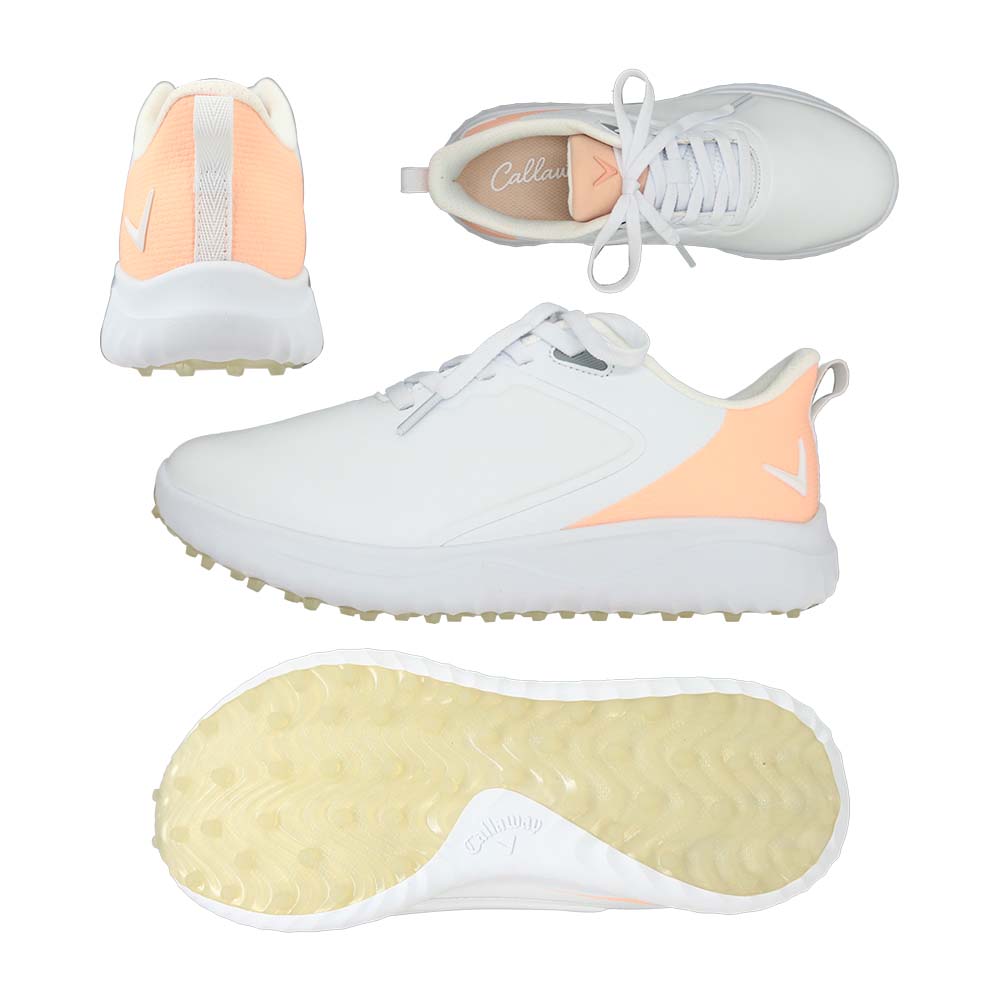 887. キャロウェイ Callawaygolf シューズ women キャロウェイ(Callaway) ANZA スパイクレスレディースシューズ C249-86240 (1031)ホワイト/ピンク 2024 メーカー名 キャロウェイ(Callaway) 基本仕様 素材アッパー:合成皮革、合成繊維、ミッドソール:EVA、アウトソール:ラバー 鋲・ソールスパイクレス 重量約230g (片足23.5cm) 取扱いサイズ22.5~24.5cm (EE相当) 取扱いカラー(1031)ホワイト /ピンク 取扱い一覧 カラー サイズ 22.5 1031 ホワイト/ピンク 1031 ホワイト/ピンク 22.5 23.0 1031 ホワイト/ピンク 1031 ホワイト/ピンク 23.0 23.5 1031 ホワイト/ピンク 1031 ホワイト/ピンク 23.5 24.0 1031 ホワイト/ピンク 1031 ホワイト/ピンク 24.0 24.5 1031 ホワイト/ピンク 1031 ホワイト/ピンク 24.5 25.0 1031 ホワイト/ピンク 1031 ホワイト/ピンク 25.0 商品説明 アッパー素材に防水性の高い合成皮革、ミッドソールにキャロウェイ独自のクッショニング素材「CRUSH-FOAM」を採用したスパイクレスシューズの新モデル「Callaway ANZA」。独自のスタッドパターンを採用したアウトソールが快適な歩行とプレーをサポートします。■無縫製アッパー。アッパーを無縫製構造にすることで、防水性と縫製ラインによるあたりを無くし、快適な履き心地を実現しています。■ミッドソール一体成型アウトソール。CRUSH-FOAMミッドソール一体成型したアウトソールにより低床化を実現。軽量で快適な履き心地をサポートします。【ブラックフライデー】 15,180円 税込 送料別 カードOK 二木ゴルフ 楽天市場店 ![]() | ||