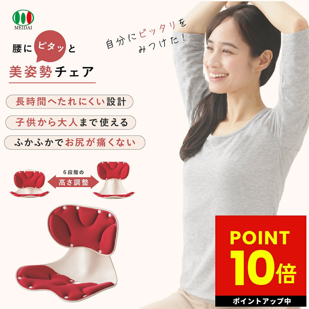 商品説明“座り方”が変わると、1日が変わる。長時間のデスクワーク。お子さまの勉強時間。食事やくつろぎのひととき。気づけば、腰が丸まり、背中が前へ…。その姿勢、実は腰やお尻に大きな負担をかけています。腰にピタッと美姿勢チェアは、医学博士×姿勢改善アドバイザーのW監修で生まれた姿勢サポート座椅子。いつもの椅子に置くだけで、まるでオーダーメイドの座り心地を実現します。■独自のS字カーブ設計医学博士監修の形状で、腰から背中にかけて自然なS字カーブをサポート。身体にフィットし、美しい姿勢をサポートします。■左右に動く背もたれ身体の動きに合わせて左右に動く構造で、長時間座っても快適。動きにフィットする設計で座り疲れを軽減します。■6段階高さ調節背もたれの高さを6段階に調整可能。お子さまから大人まで体格に合わせて使用できます。■ふかふかウレタンクッションクッションが座圧を分散し、お尻への負担を軽減。長時間座っても快適な座り心地を保ちます。・医学博士×姿勢改善アドバイザーW監修・独自のS字カーブで腰をサポート・左右に動く背もたれ構造・6段階高さ調節可能・座圧を分散するウレタンクッション・椅子に置くだけで簡単姿勢サポート商品情報商品名腰にピタッと美姿勢チェアカラーレッド材質ポリプロピレン樹脂、ポリエステル、ポリウレタン樹脂本体サイズ(約)縦40.5×横32×高さ30.5〜38.5cm本体重量(約)1115g生産国中国(企画・デザイン:日本)販売元株式会社メイダイ関連キーワード姿勢サポートチェア 姿勢矯正 椅子 座椅子 姿勢改善 腰サポート クッション 姿勢チェア 美姿勢チェア デスクワーク 椅子用クッション 腰痛対策 勉強椅子 在宅ワーク テレワーク 背筋サポート 座布団 クッション お買い得情報 セールやクーポンなど、お得な情報をまとめています。 レビューキャンペーン レビュー投稿で参加できるキャンペーンを実施中です。 ギフト 大切な方への贈り物に。ギフトラッピング対応しております。 お店について 暮らしに寄り添う、便利でやさしい商品を集めたお店です。 関連商品グイ押し ウエストストレッチャー 腰 腰痛 腰の痛み 緩和 痛み 対策...ハンドキュア SaiEL 温熱 加圧 ハンドケア ハンドマッサージ 指...WAVEWAVE Neck Revive EMS ネック ストレッチャ...1,998円8,800円9,900円股関節 痛み 腰痛 サポーター ベルト コルセット 男女兼用 うす楽ス...家庭用電気マッサージ器 ニュービブロン VL80 首こり 肩こり 肩凝...【オマケ付き!】WAVEWAVE EMS HEAT EYE ヒートアイ...8,778円8,370円9,900円\ サポートグッズ こちらもおすすめ! / ろっかん式 ストレッチクッション 座るだけでストレッチ! 立ち上がりがラクになるクッション 骨盤座椅子 凛座 全国約2000院の治療院が導入している 骨盤から考えた美姿勢サポート座椅子 背筋がGUUUN 座椅子 仕事や勉強、ゲーム中も「背すじピンッ!」 居心地最高、姿勢が良くなる座椅子 背筋がGUUUN 子供用 背筋がグーーーン! 元気に集中できるキッズ座椅子! 8,778円 税込 送料込 カードOK 便利な雑貨屋 アットケア ![]() | ||