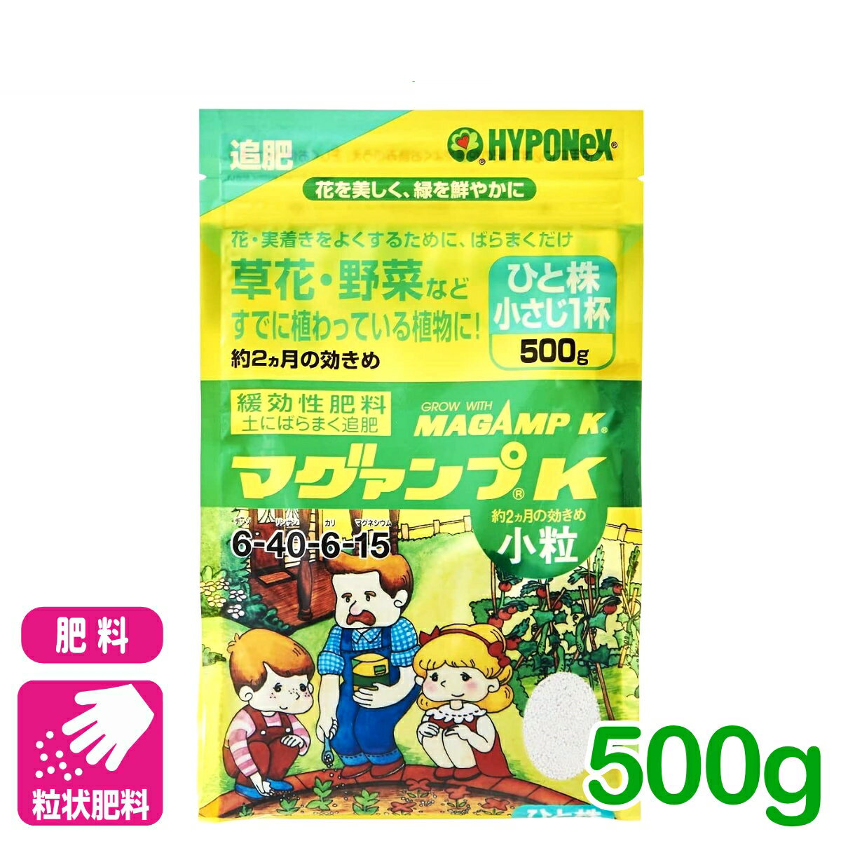 商品情報成分N-P-K-Mg=6-40-6-15 マグネシウム配合容量500g剤型粒状適用作物草花、鉢花、球根、観葉植物、野菜、芝生、グランドカバーなど詳細情報追肥として株元にばらまくだけ!株元にばらまくタイプの追肥。約2ヵ月間の効きめ。すでに植わっている植物の株元にばらまくだけで、肥料成分がゆっくり溶け、根にやさしく根の張りを良くします。リンサン効果で丈夫な根をつくり、花・実つきを良くします。草花・野菜の種まき、苗づくりの元肥としても最適です。N-P-K-Mg=6-40-6-15 マグネシウム配合※使用法:【追肥】土にばらまきます。 使い方株のまわりにばらまいてください。植物草花、鉢花、球根、観葉植物用途プランター、鉢、花壇使用量4g/1株植物野菜用途プランター、鉢、菜園使用量5g/1株植物芝生、グランドカバー用途庭使用量50g/m2(表面散布)植物種まき用途元肥使用量4g/土1L(種まき用土に混ぜ込む)計量の目安 小さじ(5cc)1杯 約4gひとにぎり男性 約25gひとにぎり女性 約15g※寄せ植えは、使用量の半量をお使いください。※植物や土、育て方などの条件により効きめの期間が異なります。※マグァンプKには中粒(約半年から1年間の効きめ)と、大粒(約1年から2年間の効きめ)もあります。植物や使用用途に合わせてお使いください。検索キーワード:草花 鉢花 果樹 観葉植物 野菜 園芸 ガーデニング 肥料 粒状 ロングセラーマグァンプK 小粒 500g ハイポネックス 初心者の心強い味方!植えつけ・植え替え時に土に混ぜ込むだけ! 2 1,020円 税込 送料込 カードOK レビュー1件 アグリエイド ![]() | ||