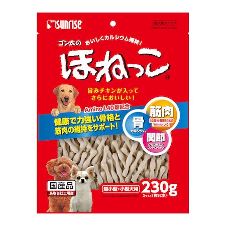 マルカン サンライズ事業部メーカーお問い合わせ:0120-64-7181【商品説明】●コツコツ食べて、健康で力強い骨格と筋肉の維持をサポート!「Amino L40」新配合により、筋肉のもとになる栄養素アミノ酸の補給に役立ちます。超小型・小型犬が食べやすいSサイズ。●原材料:穀類(小麦粉等)、肉類(チキン等)、糖類、乳類(ミルクカルシウム等)、ビール酵母、魚介類、油脂類、グルコサミン(カニ由来)、サメ軟骨抽出物(コンドロイチンを含む)、ミネラル類(リン酸カルシウム、塩化ナトリウム、焼成カルシウム)、品質保持剤(プロピレングリコール)、着色料(二酸化チタン)、増粘安定剤(グリセリン)、保存料(ソルビン酸カリウム)、アミノ酸類(ロイシン、リジン、バリン、イソロイシン、スレオニン、フェニルアラニン、メチオニン、ヒスチジン、トリプトファン)、pH調整剤、酸化防止剤(エリソルビン酸ナトリウム、ミックストコフェロール、ローズマリー抽出物)●保証成分:たん白質12.0%以上、脂質0.5%以上、粗繊維1.5%以下、灰分30.0%以下、水分25.0%以下●エネルギー:230kcal/100g●給与量の目安:超小型犬/2〜8本、小型犬/8〜14本、中型犬/14〜23本、大型犬/23〜35本、幼犬/2〜8本●賞味期限:12ヶ月●原産国または製造地:日本●犬 おやつ ガム ゴンタ ほねっこ ホネッコ カルシウム 1,072円 税込 送料別 カードOK 文具のブングット ![]() | ||