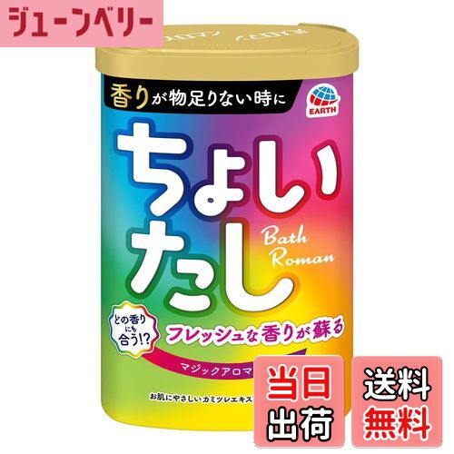 商品情報商品の説明商品紹介 商品紹介 ●香りが物足りない時に、ちょいたしできるバスロマン。●香りを楽しむご提案! ●どの香りにも合う「マジックアロマの香り」をちょいたしすると、フレッシュな香りが蘇ります。●無色透明のお湯色です。●マジックアロマの楽しみ方♪(1)香りが物足りない時にちょいたし♪フレッシュな香りが蘇る。(2)香りの変化が楽しめるカモ。・柑橘系の香り + 「ちょいたしバスロマン」 → シトラスブーケの香り・森林系の香り + 「ちょいたしバスロマン」 → リフレッシュグリーンの香り・ミルク系の香り + 「ちょいたしバスロマン」 → クリーミーシトラスの香り※ アース製薬の浴用化粧料と組み合わせてお使い頂けます。(3)そのまま使用してもアロマティックなシトラス系の香りが弾けて広がる。●お肌にやさしい天然カミツレエキス配合。(保湿成分)●アミノ酸成分配合で、入浴中のお肌を保護します。●アレルギーテスト済み。(全ての方にアレルギーが起きないわけではありません)●赤ちゃん(生後3ヵ月以上)と一緒に入浴する時も使えます。● 水に強いバリア容器です。 原材料・成分 硫酸Na、炭酸水素Na、香料、シリカ、グルタミン酸Na、カミツレ花エキス(カミツレエキス)、エタノール、水 使用方法 ・お風呂のお湯(200L)に10g~60gの割合でよくかき混ぜながら、溶かしてください。キャップで計量できます。(10g:目盛線0.5杯/60g:目盛線3杯)・お好みに応じて使用量を調節して、思う存分香りを楽しんで♪・キャップの角(すみ)からお開けください。(4ヵ所いずれからでも可能です。) 安全警告 ・入浴以外の用途には使用しないこと。・皮膚あるいは体質に異常がある場合は、医師に相談の上使用すること。・使用中や使用後、皮膚に発疹、発赤、かゆみ、刺激感などの異常が現れた場合、使用を中止し医師に相談すること。特にアレルギー体質の人や、薬などで発疹などの過敏症状を経験したことがある人は、十分注意して使用すること。・本品は食べられない。万一大量に飲み込んだときは、水を飲ませるなどの処置を行うこと。・本品には浴槽・風呂釜をいためるイオウは入っていない。・本品と異なる浴用化粧料と併用した残り湯は放置せず、入浴後は早めに残り湯を抜き、浴室用洗剤で洗うこと。時間がたつと汚れが落ちにくくなることがある。★保管上の注意・キャップをきちっと閉め、子供の手の届く所や高温・多湿の所に置かないこと。★残り湯の利用について・ちょいたしバスロマン単品使用時の残り湯は、洗濯にも使用できるが、すすぎ、柔軟仕上げには清水を使うこと。・本品と異なる浴用化粧料と併用した残り湯は、洗濯に使用しないこと。・残り湯を植物にかけると影響が出る可能性があるので、かけないこと。 続きを見る 原材料・成分 硫酸Na、炭酸水素Na、香料、シリカ、グルタミン酸Na、カミツレ花エキス(カミツレエキス)、エタノール、水 使用方法 ・お風呂のお湯(200L)に10g~60gの割合でよくかき混ぜながら、溶かしてください。キャップで計量できます。(10g:目盛線0.5杯/60g:目盛線3杯) ・お好みに応じて使用量を調節して、思う存分香りを楽しんで♪ ・キャップの角(すみ)からお開けください。(4ヵ所いずれからでも可能です。) 安全警告 ・入浴以外の用途には使用しないこと。 ・皮膚あるいは体質に異常がある場合は、医師に相談の上使用すること。 ・使用中や使用後、皮膚に発疹、発赤、かゆみ、刺激感などの異常が現れた場合、使用を中止し医師に相談すること。特にアレルギー体質の人や、薬などで発疹などの過敏症状を経験したことがある人は、十分注意して使用すること。 ・本品は食べられない。万一大量に飲み込んだときは、水を飲ませるなどの処置を行うこと。 ・本品には浴槽・風呂釜をいためるイオウは入っていない。 ・本品と異なる浴用化粧料と併用した残り湯は放置せず、入浴後は早めに残り湯を抜き、浴室用洗剤で洗うこと。時間がたつと汚れが落ちにくくなることがある。 ★保管上の注意 ・キャップをきちっと閉め、子供の手の届く所や高温・多湿の所に置かないこと。 ★残り湯の利用について ・ちょいたしバスロマン単品使用時の残り湯は、洗濯にも使用できるが、すすぎ、柔軟仕上げには清水を使うこと。 ・本品と異なる浴用化粧料と併用した残り湯は、洗濯に使用しないこと。 ・残り湯を植物にかけると影響が出る可能性があるので、かけないこと。主な仕様 香りが物足りない時に、ちょいたしできるバスロマン。マジックアロマの秘密フレッシュなアロマを閉じ込めた、どの香りにも合う不思議な香りマジックアロマの楽しみ方●その1:香りが物足りない時にちょいたし♪フレッシュな香りが蘇る●その2:香りの変化が楽しめるカモ・柑橘系の香り + 「ちょいたしバスロマン」 → シトラスブーケの香り・森林系の香り + 「ちょいたしバスロマン」 → リフレッシュグリーンの香り・ミルク系の香り + 「ちょいたしバスロマン」 → 