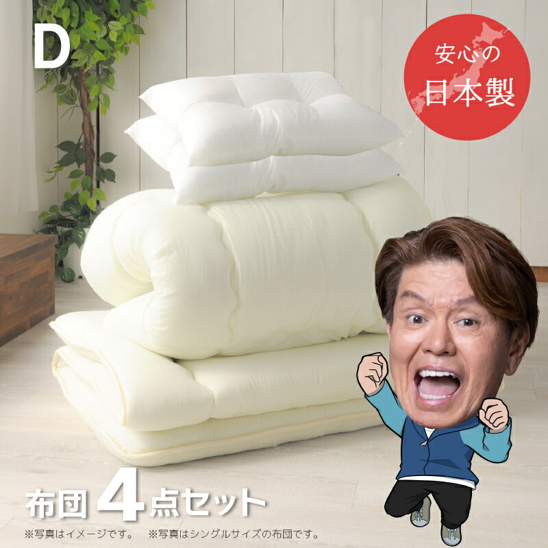 【ご希望の商品が売り切れの場合】 「商品についてのお問い合せ」ボタンより、 「入荷予定連絡希望」とお書き添えの上 送信してください。 (お取扱いが終了しているなどの場合もございます。) 商品詳細 日本製【ダブルサイズ布団4点セット】掛け布団、敷き布団、枕2個のセット。 高級な国産品 産地直送 職人が一枚一枚手作りで仕上げております。 上質な中空ポリエステル綿使用(日本製)※圧縮してコンパクトにお届けします。 (1)掛け布団はふっくら増量タイプ (2)敷き布団は三層固わたタイプ 全周を上質ヘム パイピング仕上げ (3)枕は寝やすい首 肩が楽な、低めの安定タイプ 規格 ◆size: (掛け布団)約190×200cm (敷き布団)約140×200cm ( 枕 )約43×63cm ◆素材: (布団生地)ポリエステル100% (中わた )ポリエステル100% ※サイズは全て外寸になります。 ※製品の仕様変更などに伴い、 急遽、生産国などが変わる場合がございます。 予めご了承下さい。 ※不明な点がございましたら、お気軽にお問い合わせ下さい。 備考 ※写真はイメージです。※写真はシングルサイズの布団を使用したイメージです。 ※金・土・日曜日のご注文は、原則月曜日以降の出荷となります。 (ショップカテゴリー ; セット シング 寝装品 寝室用品 リビング用品セット しんぐ 安眠寝具 寝具通販 布団セッ ト掛け敷き布団 枕 安眠寝具 快眠寝具 )ほこりの出にくい布団4点セット(ダブルサイズ) 9,980円 税込 送料込 カードOK レビュー5件 ふとん直販 ![]() | ||