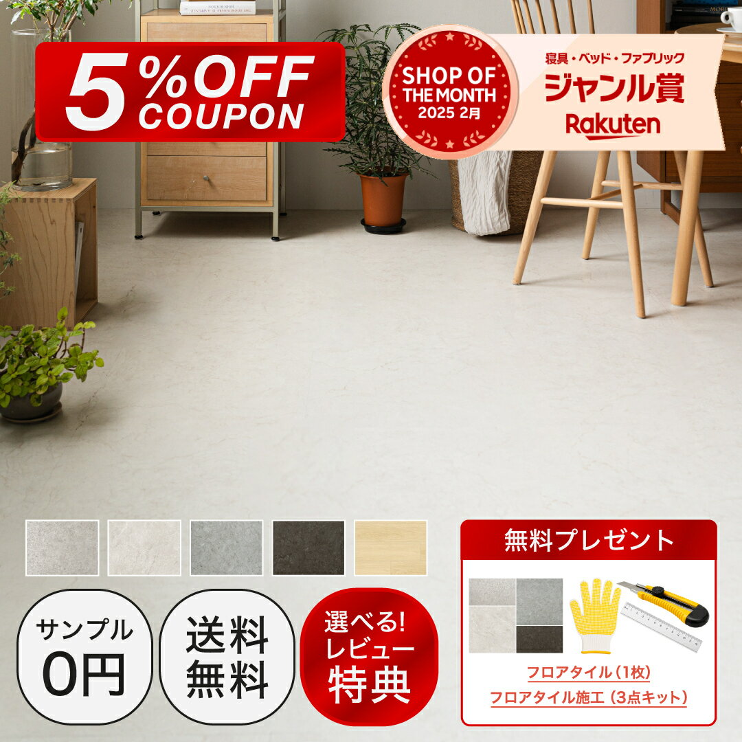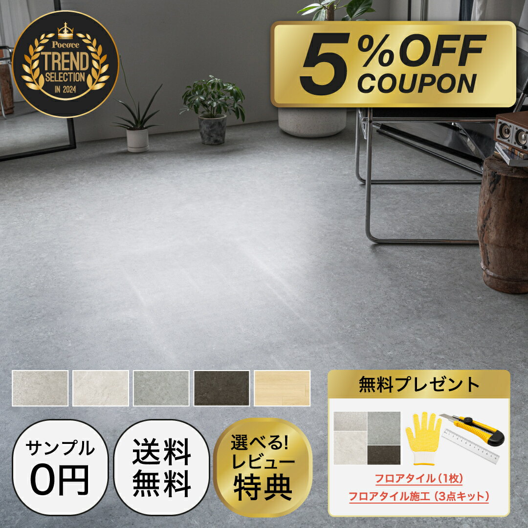 高精細印刷により、本物のコンクリートのような表面の凹凸や質感を再現。使いやすい石目調正方形フロアタイル。無機質で雰囲気のある海外インテリアや韓国インテリアのようなおしゃれな空間を作ります。 【接着剤不要・賃貸OK!置いて並べるだけ】 カッター1つで簡単にDIYが可能な置くだけフロアタイル。賃貸、ワンルーム、玄関、リビング、トイレ、脱衣所、フローリング、キッチン等のリフォーム・模様替えに。猫や犬などのペットがいるご家庭にもオススメ。【使用場所】 住宅、賃貸住宅、オフィス、レストラン、ホテル、映画館、学校 ※床材用接着剤・両面テープでの施工も可能。 【耐久性・防水性】 フロアタイルは複数層で、表面には0.1mmのコーティングが施されているので高い耐久性・耐摩耗性を持ちます。表面の特別なUVコーティングは直射日光による色落ちを防ぎます。耐衝撃性にも優れ、衝撃による破れ、割れ、凹みを防ぎます。無孔性フロアタイルでラミネートフロアやウッドフロアに比べ、水やその他液体がこぼれても浸透しません。 【寸法安定性】 湿度や温度変化によるフロアタイルの収縮、膨張、反りがありません。施工後のフロアタイル同士の隙間を防ぎます。※歩行や家具の移動によるフロアタイルのズレによって、隙間ができる可能性はあります。 【抗菌・耐薬品性・耐汚染性】 抗菌加工済み、99.9%殺菌作用。コーヒーや洗剤など一般的な家庭用品・オフィス用品によるシミや汚れを防ぎます。また、表面のしみや汚れは簡単に拭き取ることができます。 【遮音性・難燃性】 セラミック、ラミネートフロア、ウッドフロアに比べ、高い遮音性を持ちます。また、タバコの吸殻や発火性物質による引火の心配がありません。※フロアタイルの酸素指数が空気中の酸素濃度21%に対して45〜49%あります。酸素指数が21%を超える素材は、燃焼し続けません。 【大理石調 商品詳細】 ・サイズ(1枚当たり) : 450mm×450mm ・厚み : 3mm / 16枚セット(約2畳分) ・重量 : 1枚 - 約1.2kg, 1箱 - 約20kg ・素材 : PVC ・生産 : Hyundai L&C , 韓国 【木目調 商品詳細】 ・サイズ(1枚当たり) : 940×186mm ・厚み : 3mm / 10枚セット(約1畳分) ・重量 : 1枚約0.96kg(1箱約9.6kg) ・素材 : PVC ・生産 : Hyundai L&C , 韓国 【注意事項】 ・施工に関する不良はいかなる場合であっても一切責任を負いかねます。 ・柔らかい場所(畳や絨毯など)や、凹凸のある場所では使用しないでください。平らで硬い床の上でご使用ください。それ以外に床の素材によってはズレやすいものがあるので、施工前に必ずご確認ください。 ・重量のある商品となりますので、受け取りの際は十分に気を付けてください。 ・フロアタイルに付着した汚れや水分は必ず綺麗に拭き取ってください。 ・フロアタイルの掃除には強力な溶剤は使用しないでください。(シンナー等の使用は禁止) ・お手入れはウェットティッシュや水で拭き取るだけで十分効果を発揮します。 ・PVC特有のにおいがする場合がございます。定期的な換気をしてください。 ・床暖房不可 ・裏面の素材が床などに色移りする場合がございます。定期的に交換してください。 ・破損の原因となりますので、投げたり、衝撃を与えたり、折り曲げたりしないでください。 ・フロアタイルには若干の誤差がでることがあります。調整しながら敷き詰めてください。 ・製造工程により、色にバラつきがでる場合があります。必要な分を一度に購入することをおすすめします。 ・モニター画面やお客様の商品画像の閲覧環境によって、実際のお色と若干異なる場合がございます。 ・イメージ違い(例:思った色と違う等)による返品・交換はお受けいたしかねます。【注意事項】 ・施工に関する不良はいかなる場合であっても一切責任を負いかねます。 ・柔らかい場所(畳や絨毯など)や、凹凸のある場所では使用しないでください。平らで硬い床の上でご使用ください。それ以外に床の素材によってはズレやすいものがあるので、施工前に必ずご確認ください。 ・重量のある商品となりますので、受け取りの際は十分に気を付けてください。 ・フロアタイルに付着した汚れや水分は必ず綺麗に拭き取ってください。 ・フロアタイルの掃除には強力な溶剤は使用しないでください。(シンナー等の使用は禁止) ・お手入れはウェットティッシュや水で拭き取るだけで十分効果を発揮します。 ・PVC特有のにおいがする場合がございます。定期的な換気をしてください。 ・床暖房不可 ・裏面の素材が床などに色移りする場合がございます。定期的に交換してください。 ・破損の原因となりますので、投げたり、衝撃を与えたり、折り曲げたりしないでください。 ・フロアタイルには若干の誤差がでることがあります。調整しながら敷き詰めてください。 ・製造工程により、色にバラつきがでる場合があります。必要な分を一度に購入することをおすすめします。 ・モニター画面やお客様の商品画像の閲覧環境によって、実際のお色
