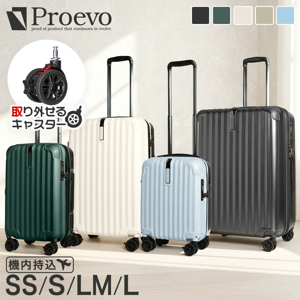 ※お問い合わせ時には商品型番をお伝えください。 商品型番10001S ブランドProevo(プロエボ) サイズSSサイズ / コインロッカー&機内持ち込み(未拡張時100席未満・LCC対応サイズ) 総外寸約46×34×20cm 重量約2.6kg 容量約24L 旅行目安【1人分の荷物を収納する場合】約1~2泊対応 商品型番10002S ブランドProevo(プロエボ) サイズSサイズ / コインロッカー&機内持ち込み(100席以上115cmサイズ) 総外寸約55x34x25cm 重量約3.0kg 容量約36~40L(拡張時) 旅行目安【1人分の荷物を収納する場合】約1~3泊対応 商品型番10003S ブランドProevo(プロエボ) サイズLMサイズ / 受託手荷物対応 総外寸約67x46x29cm 重量約3.9kg 容量約64~70L(拡張時) 旅行目安【1人分の荷物を収納する場合】約5~7泊対応 商品型番10004S ブランドProevo(プロエボ) サイズLサイズ / 受託手荷物対応 総外寸約73x52x31cm 重量約4.5kg 容量約88~97L(拡張時) 旅行目安【1人分の荷物を収納する場合】1週間以上対応 ※総外寸はキャスターやハンドルなどのパーツを含めた寸法です。 ※機内持ち込みできる荷物の重さは航空会社や路線によって異なりますが、一般的には【10kg以内(本体重量含む)】です。 役立つ旅行グッズ♪ おすすめアイテム!! メーカー希望小売価格はメーカーカタログに基づいて掲載しています▼商品レビューを書いて選べるプレゼントキャンペーン▼ ※スーツケースのご注文が対象です♪ ▼まとめ買い特価▼ [Proevo 取り外しキャスター] [Proevoのコンセプト] [Proevo no.10001S/10002S/10003S/10004S] ※SSサイズにはサイドフック・サイドハンドルがございません。 ※本商品は旧モデルです。新モデルとの違いは「ファスナー」と「キャスター」の性能の差のみです。 ▼よく一緒に閲覧されているアイテム▼ ▼パッキングで使えるアイテムはこちら!▼ 最近話題の圧縮トラベルポーチ入荷しました♪ ▼旅箱-tavivako-の嬉しいサービス▼ ▼発送から到着までにかかる日数について▼ ※平日14時までのご注文・決済で当日発送いたします 注意事項 ■総外寸はキャスターやハンドルなどのパーツを含めた寸法です。 ■機内持ち込みできる荷物の重さは航空会社や路線によって異なりますが、一般的には【10kg以内(本体重量含む)】です。 ■使用されているスマートフォン、モニターによっては商品の多少色味が違って見える場合がございます。予めご了承ください。 ■当店商品は発送前に検品をしております。開梱した形跡があっても中古品や返品商品というわけではありませんのでご安心ください。 ■こちらの商品は北海道への配送不可となります。北海道へお届けのご注文はキャンセルさせていただきます。 ■商品の仕様、デザインは改良のため予告なく変更することがあります。 ■スーツケース内のメンテナンスファスナーは通常お荷物などに引っ掛からないよう裏向きになっており、持ち手もついておりません。お荷物はメンテナンスファスナーを開けずにお詰めください。 商品説明 ●キズが目立ちにくい!エンボスボディ エンボス加工とは表面を細かな凸凹にする加工です。この加工を施すことによりスーツケース表面に付く小さなキズを目立たなくしてくれます。 ●軽量&拡張収納 このシリーズの特徴は軽さと拡張機能です。 旅先で荷物が増えても専用のファスナーを開くと収納が拡張する機能付きなので安心です。 家族旅行や海外旅行など幅広くご使用いただけるスーツケースです。 ●着脱式静音8輪キャスター 従来の静音性とストッパー機能はそのままに着脱機能を搭載。帰宅時にキャスターを外して洗い、清潔な状態で収納ができます。また、静音性に優れた8輪キャスターは早朝や深夜にスーツケースで移動する場合、どうしても気になってしまうガラガラ音を少しでも抑えてくれます。ストッパーは電車やバスの中でも勝手に転がることが無く便利で安心です。 こんなシーンにピッタリ! 帰省 出張 ビジネス 国内旅行 海外旅行 修学旅行 推し活 入院 飛行機 電車 バス 車 フェリー ≪ 旅行目安:日帰り 1泊2日 2泊3日 3泊4日 ≫ 1月:冬休み お正月 福袋遠征 成人式 2月:バレンタイン 受験 入試 新生活準備 3月:春休み 卒園 卒業 引っ越し 転勤 4月:上京 新生活 お花見 留学 5月:ゴールデンウィーク GW 野外フェス 6月:梅雨前 結婚式 ハネムーン 初夏 7月:夏休み 海外リゾート 夏フェス 8月:お盆 キャンプ 夏の展示会 9月:シルバーウィーク 学会 10月:ハロウィン 文化祭遠征 紅葉観光 11月:温泉旅行 冬支度 衣替え 12月:クリスマス 年末年始 忘年会 長期旅行 ギフトにもピッタリ! 贈り物 プレゼント 誕生日 お祝い 記念 10代 20代 30代 40代 50代 60代 70代 OL お父さん パパ お母さん ママ 弟 妹 友達 お兄ちゃん お姉ちゃん おじいちゃん おばあちゃん 会社員 社会人 大学生 女子大生 学生 主婦 カップル 彼氏 彼女 旦那さん 夫 奥さん 妻 嫁 同僚 上司 先輩 後輩 先生 【在庫限り!】Proevo 公式 スーツケース キャリーケース Sサイズ 機内持ち込み Mサイズ Lサイズ 大型 大容量 ss s lm l 拡張 ストッパー付き キャスター ロック カップホルダー 