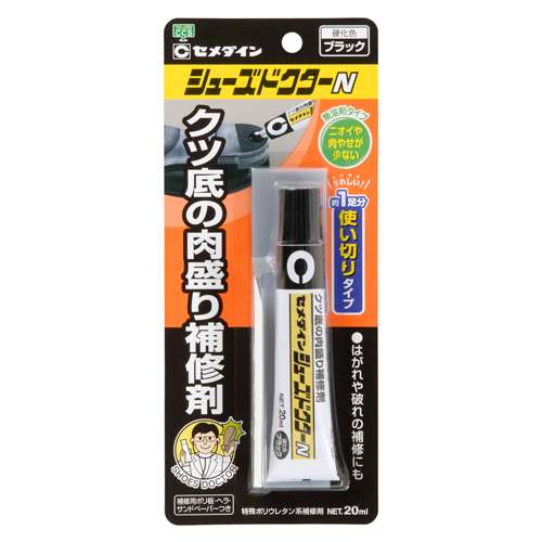 【用途】靴底の肉盛り補修剤。【機能・特徴】かかとのすり減りだけでなくはがれたときの接着剤としても使用できます。シンナーを全く含まないので室内でも、いやなニオイがありません。硬化後は塗装ができ、微妙な色あわせも可能です。【仕様】●内容量:20mL。●色:ブラック。●環境対策商品。●付属品:補修用ポリ板・ヘラ・サンドペーパー。【送料について】北海道、沖縄、離島は送料を頂きます。【ご注意!!】メーカー取寄せ商品の為、ご注文頂いたタイミングによっては... 1,100円 税込 送料別 カードOK リコメン堂 ![]() | ||