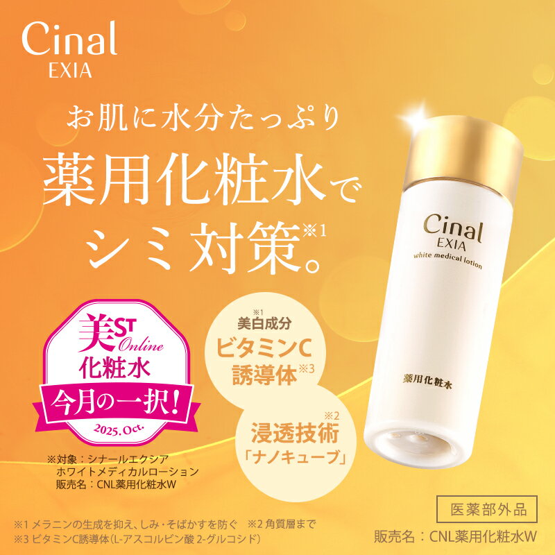 W美白 *1 ・ W抗炎症 *2 の効果がある有効成分を配合 *1 メラニンの生成を抑え、しみ、そばかすを防ぐ *2 炎症を抑え、肌あれを防ぐ べたつきすぎず、さっと使える質感の薬用美白化粧水です。W美白※1・W抗炎症※2の効果がある有効成分を配合しています。天然由来精油を使用したオレンジ&ラベンダーの香り。 ※1 メラニンの生成を抑え、しみ、そばかすを防ぐ ※2 炎症を抑え、肌あれを防ぐ 商品名 シナールエクシア ホワイトメディカルローション120mL 販売名:CNL薬用化粧水W(医薬部外品) 内容量 120mL 効能・効果 メラニンの生成を抑え、しみ、そばかすを防ぐ。肌あれ。あれ性。あせも・しもやけ・ひび・あかぎれ・にきびを防ぐ。油性肌。かみそりまけを防ぐ。日やけ・雪やけ後のほてりを防ぐ。肌をひきしめる。肌を清浄にする。肌を整える。皮膚をすこやかに保つ。皮膚にうるおいを与える。 成分 【有効成分】 L−アスコルビン酸 2−グルコシド、アルブチン、トラネキサム酸、グリチルリチン酸ジカリウム 【その他の成分】 クエン酸、クエン酸ナトリウム、濃グリセリン、水酸化カリウム、精製水、オウバクエキス、オレンジ油、ラベンダー油、ビオチン、1,3−ブチレングリコール、フェノキシエタノール、カラメル、ジプロピレングリコール、イソステアリン酸、天然ビタミンE、キサンタンガム、ジエチレントリアミン五酢酸五ナトリウム液、ポリオキシエチレンポリオキシプロピレンデシルテトラデシルエーテル、アクリル酸アルキル共重合体エマルション(1)、1,2−ペンタンジオール、テトラ2−ヘキシルデカン酸アスコルビル、N−ステアロイルジヒドロスフィンゴシン、フィチン酸液、ポリオキシエチレンオクチルドデシルエーテル、植物性スクワラン、タイムエキス(1)、スフィンゴ糖脂質 ご使用方法 洗顔後、適量をコットンまたは手のひらにとり、お肌にやさしくなじませてください。 ※ご使用量の目安:500円硬貨大 ご使用上の注意 【使用上の注意】 1. お肌に異常が生じていないかよく注意して使用してください。 2. 傷、はれもの、湿疹等、異常のあるときは使わないでください。 3. 使用中、又は使用後日光にあたって、赤味、はれ、かゆみ、刺激、色抜け(白斑等)や黒ずみ等の異常があらわれたときは、 使用を中止し、皮膚科専門医等にご相談されることをおすすめします。そのまま使用を続けますと悪化することがあります。 4. 使用後は必ずしっかりキャップをしめてください。 5. 乳幼児の手の届かないところに保管してください。 6. 極端に高温又は低温の場所、直射日光のあたる場所には保管しないでください。 販売者 シオノギヘルスケア株式会社 広告文責/メーカー シオノギヘルスケア株式会社0120-810-771 生産国 日本製 ■配送方法: ・こちらの商品をお買い上げの場合『ヤマト運輸』でお届けいたします。 ・追跡サービスで出荷してからお届けまでの配送状況を確認する事ができます。 ・おおむね6-7日程でお届けとなります。 ※ご注文者様とお届け先が異なる場合は、「クレジット払い」をご利用ください。「代引き支払い」をお選びいただいた場合は、後ほどお支払い方法の変更依頼のご連絡をさせて頂きます。 関連KW セット くすみ ケア 薬用化粧水 肌荒れ スキンケア 美容液 化粧水 乳液 化粧水 美容液 スキンケア※1 メラニンの生成を抑え、しみ、そばかすを防ぐ 4,950円 税込 送料込 カードOK レビュー50件 シオノギヘルスケアONLINE ![]() | ||