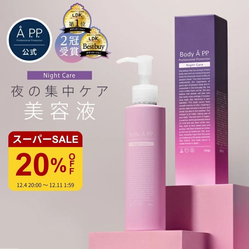 商品説明 夜の集中保湿ケアで、老廃物を除去して(※1)うるおいをチャージ。 理想のボディを手に入れる、ナイトケアボディ美容液が登場です。 「Body Å P.P. Night Care」は、睡眠時間に着目し、1本でボディの3大悩み「ざらつき」「くすみ」「不快感」をケア。 ヤグルマギク花エキスを配合し、老廃物(※1)をすっきりケアし肌をひきしめます。 また、夜の集中ケア保湿成分、トウキンセンカ花エキスを配合。アルガンオイルやシアバター、セラミドも配合し、内側(※2)からしっとりと... 2,992円 税込 送料込 カードOK レビュー16件 CaetusTechnology 楽天市場店 ![]() | ||