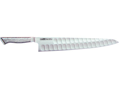 -鋼材- オリジナル刃物鋼"V鋼シリーズ"を製造している武生特殊鋼材(株)が新たに作り出したステンレス刃物鋼V金10号を使っています。 厳選された純度の高い原料鉄を用い、最高の精鋼技術で作られたV金10号は、靱り強く、加工性、鍛造性に優れています。 またコバルト(Co)を添加することにより素地を強化し切れ味の持続性を向上させました。 そして被削性は良好ですので研ぎ直しも容易に出来ます。両面にディンプルを施し、食材との抵抗を抑えた優れものです。-用途- 和牛刀は、和食の料理人さんが使いやすいよう日頃使い慣れている和包丁の柄を取り入れ、刃を単一素材で仕上げた和洋折衷の包丁です。 日本伝統の和の雰囲気にマッチするようにデザインされています。 肉から野菜まで幅広く 使える和食用の万能包丁です。-注意- 鋼よりはるかに錆びにくいですが 酸や塩をそのままにすると錆びてきますので手入れが必要です。 使い終わった後は汚れを洗い落とし、水分を乾いた布で完全にふきとってください。 冷凍物にはお使いいただけません。 【商品仕様】 サイズ 刃渡り:255mm 全長:415mm 重量 170g 鋼材・刃の形状 V金10号 両刃 柄 朴材八角柄 水牛巻 名入れ 出来ます 刃付け 出来ます サヤ 別売になります サービス券 付いています ※サイズ、重量は目安にしてください。 一文字厨器で包丁をお買上げいただいた方に、最後まで満足して使っていただくために無料でさまざまなサービス特典が付いております。 ※一部対象外の商品もございますので、詳しくはお買上げ特典のページをご覧下さい 44,800円 税込 送料込 カードOK 堺刃物 堺一文字光秀の包丁専門店 ![]() | ||