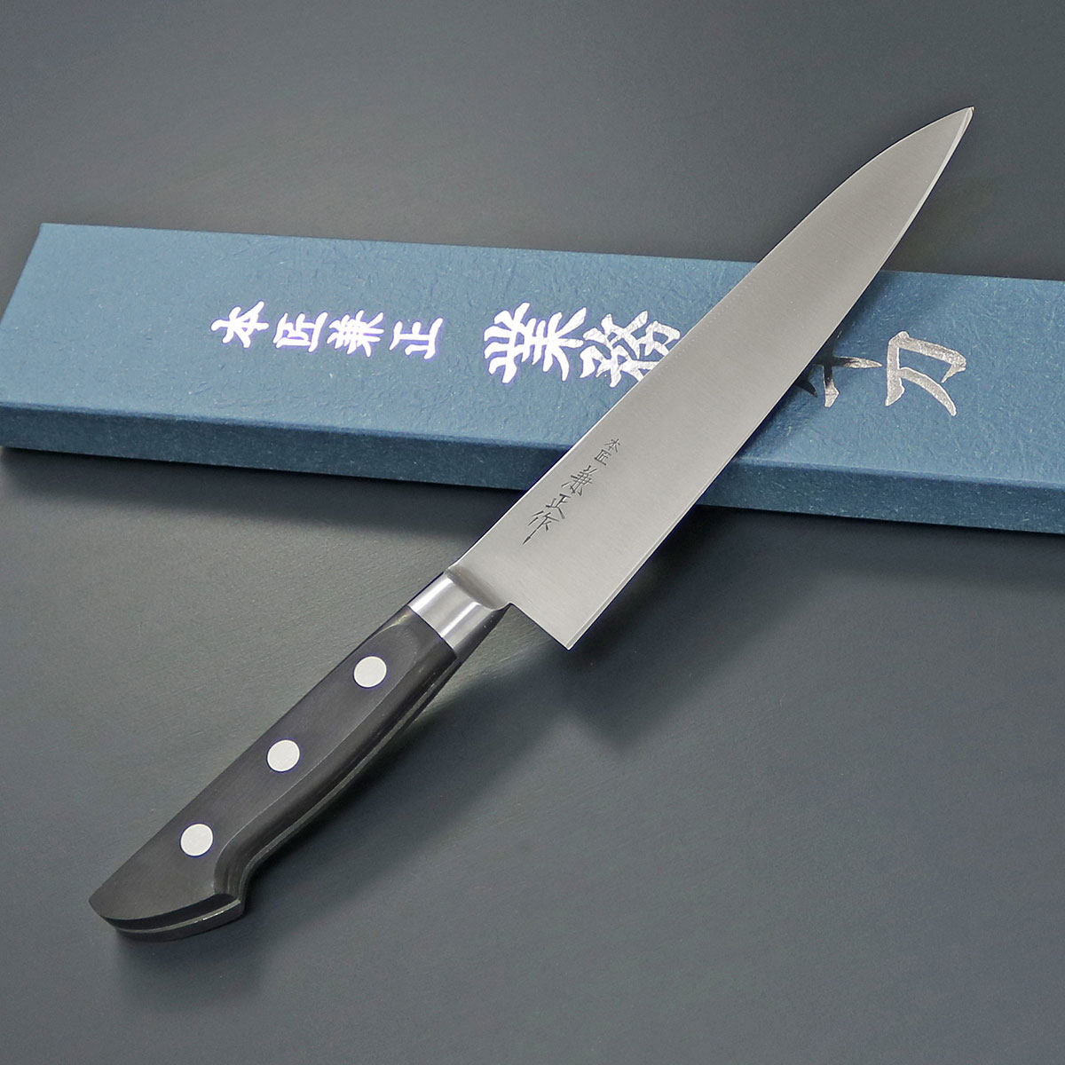 本匠兼正 全鋼ツバ付黒柄 牛刀 180mm 業務用包丁のロングセラー。研ぎやすく、鋭い切れ味を誇る全鋼包丁の最高峰シリーズ。 使い込むほどに信頼感が増す包丁です。 ブレードはいわゆる「全鋼」で、炭素鋼の単層鋼(無垢材)です。ステンレスではないので、 錆びやすいので注意が必要です。 HRC硬度 : 61±0.5の高硬度SK-95(SK-4)を使用。 鋭い切れ味で本職用として高いパフォーマンスを発揮します。 無駄のないシンプルで機能的なデザインです。 中子形状は本通し(フルタング)で、口金は溶接されています。ハンドル材の黒合板は耐水性のある丈夫な材質で しっかりと3か所でカシメられています。まさにハードユースに耐えうる構造の業務用包丁です。 「牛刀180mm」は、一般のご家庭においても大変使い勝手が良く、「三徳」同様に人気があるモデルです。 ■刃渡り 180mm ■ブレード材質 SK-95(SK-4)(日本鋼ハガネ) ■ハンドル材質 黒合板 / 口金:ステンレス(溶接) ■備考 ※冷凍食品は必ず解凍してからお使いください。 贈り物としても 古くは「お守り刀」を贈る風習もありましたが、昨今では刃物は”未来を切り開く” として縁起の良い贈り物としてプレゼントされる方も増えています。 当店では無料でギフトラッピングにも対応させて頂きます。 ニューワールドネット名品倶楽部 ニューワールドネット名品倶楽部を運営する(株)北正は、 「刃物の街」岐阜県関市で創業から約70年以上にわたり 一貫して刃物を取り扱っております。 岐阜県関市を中心に、優れた刃物を提供する事をモットーにしており、 長年にわたる豊富な経験と実績をもとに、刃物のプロによって選定された刃物 (ナイフ、包丁をはじめハサミ、爪切り等)は信頼できるものばかり。良質なハガネを使用した業務用牛刀扱いやすさ重視。 良質な鋼(日本鋼)を使用した高級牛刀。非常に扱いやすく、使えば使うほど手に馴染んできます。思い通りの刃付けが自分で出来、切れ味も最高。 12,100円 税込 送料込 カードOK ニューワールドネット名品倶楽部 ![]() | ||