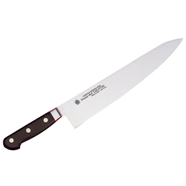 【 本刃付け 】 砥石による本格的な刃付けを施し、鋭い切れ味を長く持続させます。 【 本研刃造り 】 プロの技術者により、本刃付けする前に研ぎなおしを容易にするため、水砥の荒砥・中砥を使用し、刃基を研ぎだしてあります。 【 一体構造 】 刀身とハンドルはすき間のない一体構造で非常に衛生的です。 【 モナカハンドル 】 ハンドル部を空洞にし、軽くていつまでも美観を保つ「ステンレスモナカ構造」を採用。 また、18-8ステンレス鋼を使用し水・洗剤等の高圧・高温殺菌洗浄を可能にした衛生的なハンドルです。 ※次亜塩素酸・塩素等での殺菌は使用しないでください。 【 3層鋼 】 サビにくい13クロームステンレスに、刃物鋼では最高級のモリブデン・バナジウム鋼を刃部に割込み、 最新の設備と高度な技術で造り上げられた製品ですので、使い始めから本格的な切れ味のよさが得られます。 【 材質 】 刀身/モリブデン・バナジウム鋼 割込 ハンドル/18-8ステンレス鋼 【 牛刀 】 TK-1102 牛刀 300mm購入はこちら。 TK-1103 牛刀 270mm購入はこちら。 TK-1104 牛刀 240mm購入はこちら。 TK-1105 牛刀 210mm購入はこちら。 TK-1106 牛刀 180mm購入はこちら。 11,820円 税込 送料込 カードOK 瀧商店 ![]() | ||