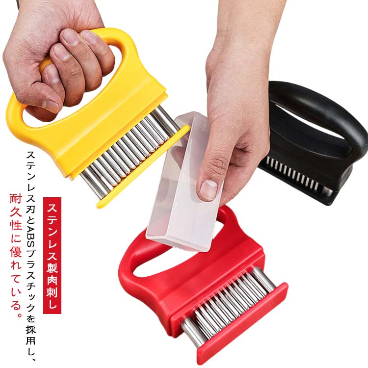 お店の味をご家庭で味わえる家庭の台所、ホテル、レストランなどに最適です。お肉を簡単に柔らかくする魔法のツール!プロも愛用!牛、豚、羊、鶏等あらゆるお肉のステーキ、焼肉、カツ、シチュー、その他様々な料理にご使用いただけます。肉たたきと同じ効果が得られ、手軽に固い赤身のお肉が柔らかく! 美味しいお肉がより経済的に召し上げれます。特製の48本のステンレス刃が、風味、形を損なうことなくジューシーなお肉に大変身! あらゆる肉に対応可能!ワンランク上の肉を楽しもう。筋切り器を使用することで肉の内部も細かく切れているので、調味料などが染み込みやすくなったり、調理時間が短縮します。片手で扱いやすいサイズで片手で使いやすく、グリップタイプなので、しっかりと握ることができるので扱いやすく便利です。取り外しも簡単!刃の間に残った肉の繊維などもきれいに洗浄でき、いつでも清潔にご使用いただけます!使用しないときは専用のケースにしまっておけるので収納時も安全です。 ●製造ロットにより、細部形状の違いや、同色でも色味に多少の誤差が生じます。 ●パッケージは改良のため予告なく仕様を変更する場合があります。 ▼商品の色は、撮影時の光や、お客様のモニターの色具合などにより、実際の商品と異なる場合がございます。あらかじめ、ごください。 ▼生地の特性上、やや匂いが強く感じられるものもございます。数日のご使用や陰干しなどで気になる匂いはほとんど感じられなくなります。 ▼同じ商品でも生産時期により形やサイズ、カラーに多少の誤差が生じる場合もございます。 ▼他店舗でも在庫を共有して販売をしている為、受注後欠品となる場合もございます。予め、ごお願い申し上げます。 ▼出荷前に全て検品を行っておりますが、万が一商品に不具合があった場合は、お問い合わせフォームまたはメールよりご連絡頂けます様お願い申し上げます。速やかに対応致しますのでご安心ください。 指定された配送時間は承っておりません。【スリーペア】 1,580円 税込 送料別 カードOK スリーペア ![]() | ||