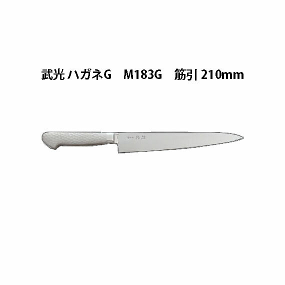 【 本刃付け 】 砥石による本格的な刃付けを施し、鋭い切れ味を長く持続させます。 【 本研刃造り 】 プロの技術者により、本刃付けする前に研ぎなおしを容易にするため、水砥の荒砥・中砥を使用し、刃基を研ぎだしてあります。 【 モナカハンドル 】 ハンドル部を空洞にし、軽くていつまでも美観を保つ「ステンレスモナカ構造」を採用。 また、18-8ステンレス鋼を使用し水・薬品等の高圧・高温殺菌洗浄を可能にした衛生的なハンドルです。 ※次亜塩素酸・塩素等での殺菌は使用しないでください。 【 表面加工 】 ブラストを荒くすることにより表面の凹凸を大きくつくり、すべり止め加工をしています。 【 強度を持たせる溶接 】 柄の継ぎ目を溶接することにより、密着度が高まり強度が増しました。 【 材質 】 刀身/ハガネ ハンドル/18-8ステンレス鋼 【 筋引包丁と骨スキ 】 M178G 筋引 300mm購入はこちら。 M179G 筋引 270mm購入はこちら。 M180G 筋引 240mm購入はこちら。 M183G 筋引 210mm購入はこちら。 M181G 骨スキ 東型 150mm購入はこちら。 8,920円 税込 送料込 カードOK 瀧商店 ![]() | ||