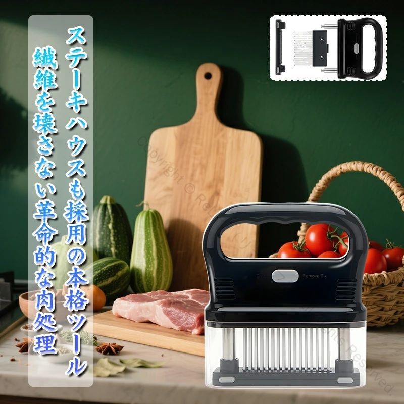 手軽にお肉を柔らかくする肉筋切り器。片手で握りやすいデザイン、たっぷり48刃で一瞬で牛肉・豚肉・鶏肉等あらゆる固い食肉の繊維や筋をカットするミートソフター。この肉筋切り器を使って、肉の質が格段に向上し、やわらかく、噛みやすく、食べやすくなります。肉の内部も細かく切れているので、調味料などが染み込みやすくなったり、調理時間が短縮します。その繊細な刃は、肉汁や風味をほとんど損ないません。 サイズ 2個セット サイズについての説明 F 10.8*12.5cm※サイズ表の実寸法は商品によって1-3cm程度の誤差がある場合がございます。 素材 ステンレス PP 色 ブラック 備考 ●サイズ詳細等の測り方はスタッフ間で統一、徹底はしておりますが、実寸は商品によって若干の誤差(1cm~3cm )がある場合がございますので、予めご了承ください。 ●製造ロットにより、細部形状の違いや、同色でも色味に多少の誤差が生じます。 ●パッケージは改良のため予告なく仕様を変更する場合があります。 ▼商品の色は、撮影時の光や、お客様のモニターの色具合などにより、実際の商品と異なる場合がございます。あらかじめ、ご了承ください。 ▼生地の特性上、やや匂いが強く感じられるものもございます。数日のご使用や陰干しなどで気になる匂いはほとんど感じられなくなります。 ▼同じ商品でも生産時期により形やサイズ、カラーに多少の誤差が生じる場合もございます。 ▼他店舗でも在庫を共有して販売をしている為、受注後欠品となる場合もございます。予め、ご了承お願い申し上げます。 ▼出荷前に全て検品を行っておりますが、万が一商品に不具合があった場合は、お問い合わせフォームまたはメールよりご連絡頂けます様お願い申し上げます。速やかに対応致しますのでご安心ください。 2,520円 税込 送料込 カードOK GlobalTime 楽天市場店 ![]() | ||