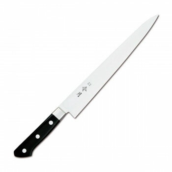 【 本刃付け 】 砥石による本格的な刃付けを施し、鋭い切れ味を長く持続させます。 【 本研刃造り 】 プロの技術者により、本刃付けする前に研ぎなおしを容易にするため、水砥の荒砥・中砥を使用し、刃基を研ぎだしてあります。 【 サブゼロ処理 】 1050℃で焼き入れ後に、−73℃以下に冷却する特別な処理により高い硬度と靭性を与え、切れ味を一段と高めてあります。 【 ツバ 】 一体口金付きで衛生的。 【 ハンドル 】 耐腐触性に優れた黒積層強化木。 【 デポット加工 】 デポット加工により食材と刃の接触面積が減り、食材への抵抗が少なくなり切れ味がよくなります。 【 材質 】 刀身/モリブデン・バナジウム鋼 ハンドル/抗菌剤入り黒積層強化木 【 筋引包丁 】 M1012 筋引 270mm購入はこちら。 M1013 筋引 240mm購入はこちら。 13,060円 税込 送料込 カードOK 瀧商店 ![]() | ||