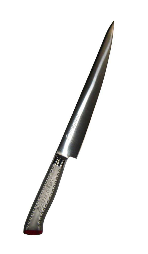特長 ハンドルは抗菌加工が施され、衛生管理に最適。 現場の声にもとずいた握りやすく、疲れない、滑りにくい、 耐久性抜群のハンドル。 熱湯殺菌(100℃ 20分)にも対応。 インサート成型により口元からの水、雑菌の浸入を防ぎ ます。材質 刀身:モリブデンバナジウム鋼(ゼロクリア加工) ハンドル:エラストマー樹脂 (ノバロン銀系無機抗菌剤配合) 耐熱温度:115℃*御注文の際は、色を御指定ください。メーカー品番24 サイズ(cm)E-163R 全長(mm)370 質量(g)140 背厚(mm)2.... 6,976円 税込 送料別 カードOK ダイニングマート ![]() | ||