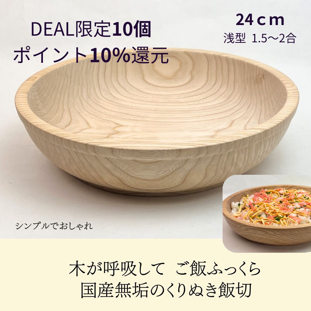 ■ 商品について 国産栓の木の木目を大切にしながら、熟練の職人が一つひとつ無垢からくりぬいて作った飯切りです。 桶とは違い角がなく混ぜやすく、洗いやすくて丈夫。内側は無塗装で、木が酢飯の水分をほどよく調整し、美味しい酢飯に仕上がります。 ボウル形状なので、こね鉢としてもお使いいただけます。 ■ 使い方・用途の広さ お素麺や釜揚げうどんにもお使いいただけます。 寿司桶として使わない時は、果物を入れたり、お鉢代わりにしたりと、テーブルの上を華やかに彩ります... 30,800円 税込 送料込 カードOK レビュー32件 カネキン小椋製盆所 ![]() | ||