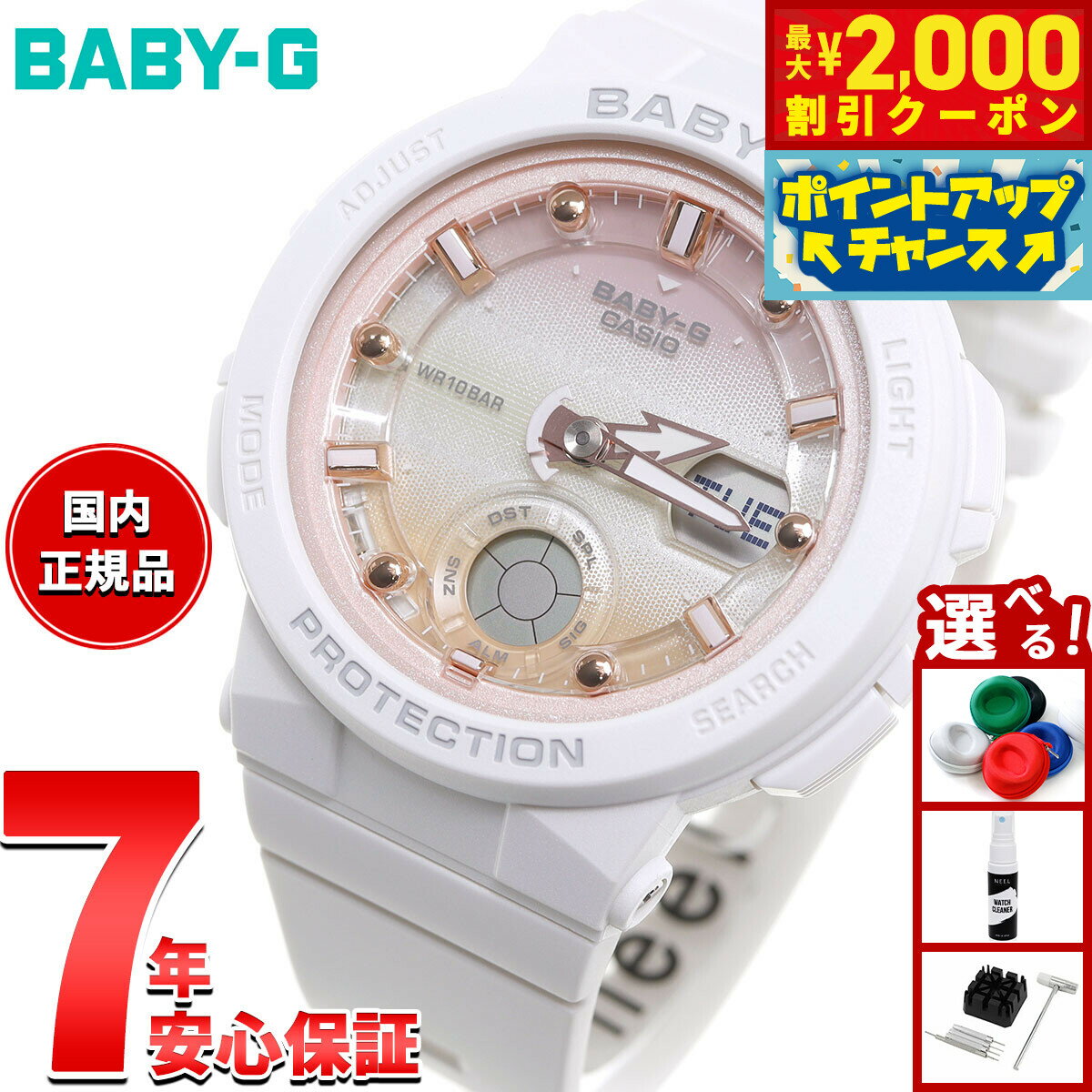 ※初回入荷数に限りがあるため、入荷予定が遅れる場合がございます。あらかじめご了承ください。アクティブな女性のためのカジュアルウオッチBABY-Gから、夏のビーチをテーマにした「ビーチ・トラベラー・シリーズ」が登場します。今回のモデルは、ビーチ周辺で見られる美しいものをテーマにしたシリーズ。ビーチ沿いに広がる街の夜景を連想させるブラック、透き通る海をイメージしたブルー、太陽の光を反射し輝く貝殻のピンク、真っ白な砂浜のホワイト等を各モデルにカラーリング。夏の楽しい思い出やお気に入りの風景を連想させ、気分を上げるデザインです。文字板の見切り部分にはスケルトン素材を採用し、海の水面を表現。時分針や見切りインデックスには舵と錨のモチーフをデザインし、ビーチアクティビティにぴったりのモチーフを散りばめました。インデックスはバーインデックスを採用しシンプルに仕上げています。また、内蔵のブラックライトに反応してフェイスが発光するネオンイルミネーターを搭載。ライトを点灯すると、時分針がピンクや緑に光り幻想的な夜の海を連想させます。夏に向けて旅行やビーチアクティビティのシーンを盛り上げる、New BABY-Gの登場です。商品名カシオ ベビーG CASIO BABY-G 白 腕時計 レディース Beach Traveler Series BGA-250-7A2JF商品番号BGA-250-7A2JFブランドカシオ ベビーG CASIO BABY-Gムーブメントアナデジ クォーツ モジュールNo:5570■耐衝撃構造■10気圧防水機能■ワールドタイム:世界27都市(29タイムゾーン、サマータイム設定機能付き)+GMT(グリニッジ標準時)の時刻表示■ストップウオッチ(1秒、60分計、スプリット付き)■タイマー(セット単位:1分、最大セット:60分、1秒単位で計測、オートリピート、タイムアップ予告機能付き)■時刻アラーム5本(1本のみスヌーズ機能付き)・時報■電池寿命約3年■フルオートカレンダー■12/24時間制表示切替■LEDライト(ネオンイルミネーター、残照機能付き、残照時間切替(1.5秒/3秒)付き精度:±30秒ショックレジストネオブライト風防素材無機ガラスケース素材樹脂ケースサイズ45.1×41mmケース厚13.3mmバンド素材樹脂バンドバンド留金タイプ美錠腕周り(最大)18cm本体重量33g保証期間メーカー正規保証1年間付属取扱説明書 / 保証書 / 専用BOXその他のサービスメーカー希望小売価格はメーカーサイトに基づいて掲載していますカシオ ベビーG CASIO BABY-G 白 腕時計 レディース Beach Traveler Series BGA-250-7A2JF アクティブな女性のためのカジュアルウオッチBABY-Gから、夏のビーチをテーマにした「ビーチ・トラベラー・シリーズ」が登場します。今回のモデルは、ビーチ周辺で見られる美しいものをテーマにしたシリーズ。ビーチ沿いに広がる街の夜景を連想させるブラック、透き通る海をイメージしたブルー、太陽の光を反射し輝く貝殻のピンク、真っ白な砂浜のホワイト等を各モデルにカラーリング。夏の楽しい思い出やお気に入りの風景を連想させ、気分を上げるデザインです。文字板の見切り部分にはスケルトン素材を採用し、海の水面を表現。時分針や見切りインデックスには舵と錨のモチーフをデザインし、ビーチアクティビティにぴったりのモチーフを散りばめました。インデックスはバーインデックスを採用しシンプルに仕上げています。また、内蔵のブラックライトに反応してフェイスが発光するネオンイルミネーターを搭載。ライトを点灯すると、時分針がピンクや緑に光り幻想的な夜の海を連想させます。夏に向けて旅行やビーチアクティビティのシーンを盛り上げる、New BABY-Gの登場です。 11,440円 税込 送料込 カードOK レビュー31件 neelセレクトショップ ![]() | ||