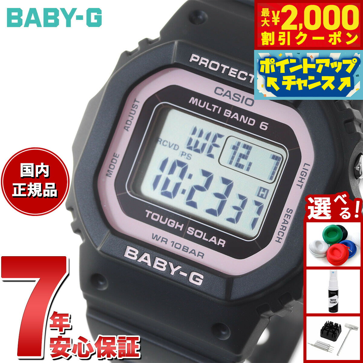 BGD-5650-1JF ブラック BGD-5650-1BJF ブラック×ピンク BGD-5650-2JF ネイビー BGD-5650-4JF くすみピンク BGD-5650-5JF ブラウン BGD-5650-7JF ホワイト BGD-5650-1CJF フルブラック アクティブな女性のためのカジュアルウオッチBABY-Gから、人気のスクエアデザインを採用したモデルです。 ケースサイズで縦方向2.6mm、横方向2.1mmの小型化を実現しました。厚みも1.2mmのスリム化を図ると同時に、より薄く見せるため、ケースをサイドから見てフラットとなるデザインに仕上げました。カラーは様々なコーディネートに取り入れやすいベーシックなカラーリングです。 また、機能面では、世界6局の標準電波に対応した電波受信機能やタフソーラーも搭載。更に10気圧防水機能にも対応し実用性も兼ね備えています。 季節を問わず幅広いファッションに合わせやすいウオッチです。 ケースサイズ(縦×横×厚さ):42.1 × 37.9 × 11.3 mm 質量:31 g ケース・ベゼル材質:樹脂 樹脂バンド 耐衝撃構造(ショックレジスト) 10気圧防水 電波時計 日本・北米・ヨーロッパ・中国地域対応 MULTIBAND6 ガラス:無機ガラス バンド装着可能サイズ:125〜175mm ワールドタイム5本:世界48都市(31タイムゾーン)+UTC(協定世界時)の時刻表示、ホームタイムの都市入替機能付き ストップウオッチ(1/100秒(1時間未満)/1秒(1時間以上)、24時間計、スプリット付き) タイマー(セット単位:1秒、最大セット:24時間、1秒単位で計測) 時刻アラーム5本(1本のみスヌーズ機能付き)・時報 LEDバックライト(スーパーイルミネーター、残照機能、残照時間切替(1.5秒/3秒)付き) LED:ホワイト フルオートカレンダー 操作音ON/OFF切替機能 パワーセービング機能(暗所では一定時間が経過すると表示を消して節電します) バッテリーインジケーター表示 駆動時間:フル充電時からソーラー発電無しの状態での駆動時間 機能使用の場合:約11ヵ月 パワーセービング状態の場合:約22ヵ月 ※電波受信が行われない場合は、通常のクオーツ精度(平均月差±15秒)で動作します。 日付表示(月/日表示入替) 曜日表示(英・西・仏・独・伊・露の6ヵ国語切替) 12/24時間制表示切替 時刻修正詳細: ホームタイム都市<受信機能対応都市> / 受信電波 東京、ソウル、台北 / 日本の標準電波 JJY40・JJY60 (ホノルル)、(アンカレジ)、バンクーバー、ロサンゼルス、エドモントン、メキシコシティ、シカゴ、ニューヨーク、ハリファックス、セントジョンズ / アメリカの標準電波 WWVB リスボン、ロンドン、マドリード、パリ、ローマ、ベルリン、ストックホルム、アテネ、(モスクワ) / イギリスの標準電波 MSF・ドイツの標準電波 DCF77 香港、北京 /中国の標準電波 BPC ※( )内の各都市は条件が良ければ受信する場合もあります。 ◆ よくあるご質問(FAQ)◆ Q. サイズ感はどのくらいですか? 女性の腕でも大きすぎませんか? A. このモデルは、ケースサイズ約42.1×37.9mm・厚み約11.3mm・重さ約31gと、Baby-Gの中でもコンパクトで軽量なタイプです。 ゴツすぎないスクエアフォルムなので、手首の細い方やアクセサリー感覚でつけたい方にもバランスよくお使いいただけます。 Q. 電波ソーラーとは何ですか? 電池交換は不要でしょうか? A. 電波ソーラーは「光で充電」+「電波で自動時刻修正」をしてくれる便利な機能です。 室内の明かりや太陽光で発電して二次電池に蓄える仕組みのため、通常の電池式時計のような定期的な電池交換の手間が大幅に減ります。 また、日本を含む世界各地の標準電波を受信して、自動で正確な時刻に合わせてくれるので、毎日の時刻合わせもほとんど不要です。 Q. 防水性能はどのくらいですか? 日常の水まわりでも使えますか? A. 本モデルは10気圧防水仕様です。 炊事・洗濯・手洗い・雨・洗顔時の水しぶき程度であれば問題なくご使用いただけます。 プールや軽いマリンレジャーでもお使いいただけるレベルですが、「水中でボタン操作をしない」など、取扱説明書に記載の注意事項を守ってご使用ください。 Q. ベルトの長さが心配です。どのくらいの手首サイズまで合いますか? A. 樹脂バンド仕様で、一般的な女性の手首周りでしたらほとんどの方にフィットするサイズ感です。 ご不安な場合は、ご自身の手首周りをメジャーで測っていただき、「手首まわり+余裕5〜10mm」ほどを目安にしていただくと安心です。 Q. 正規品ですか? 保証はついていますか? A. 当店BLESSYOUでお取り扱いしているBaby-GはすべてCASIOより直接仕入れいる国内正規品です。もちろん新品・未使用品となります。 メーカー保証書・専用BOX・取扱説明書が付属し、保証期間内は規定に沿って無償修理が受けられる安心の正規保証対象品です。 Q. ギフト・プレゼント用にラッピングはできますか? A. はい、承っております。 誕生日プレゼント・クリスマスギフト・就職祝いや記念日の贈り物としてご利用いただくお客様が多く、無料(または有料)ラッピングもご用意しております。 ご希望の場合は、ご注文画面の備考欄に「ラッピング希望」とご記入ください。ラッピング用紙もお選びいただけ