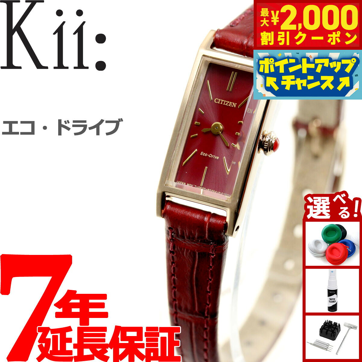 アンティークなデザインでエコ・ドライブという機能性も併せ持つ、シチズン Kii: (キー)。ハンサムな印象のケースラインが特徴の長角ケースに、クラシカルな印象のカットガラスがポイント。文字板はすっきりとした印象のバーインデックスを採用し、小さいながらも視認性の良い1本。年齢を問わず愛せるオーセンティックな1本です。商品名シチズン キー CITIZEN Kii: エコドライブ ソーラー 腕時計 レディース EG7043-09W商品番号EG7043-09Wブランドシチズン キー CITIZEN Kii:ムーブメントエコ・ドライブ キャリバー:G620精度:月差±15秒光発電:フル充電時約8ヶ月可動時刻合わせ告知機能充電警告機能過充電防止機能日常生活用防水風防素材カットスリスタルガラスケース素材ステンレス(金色めっき)ケースサイズ23×14.3mmケース厚7.5mmバンド素材牛革バンド留金タイプ美錠バンド幅10mm文字盤カラーレッド保証期間メーカー1年間保証付属保証書 / 専用BOXその他のサービス シチズン キー CITIZEN Kii: エコドライブ ソーラー 腕時計 レディース EG7043-09W 正規品 クリックで画像拡大クリックで画像拡大クリックで画像拡大クリックで画像拡大クリックで画像拡大クリックで画像拡大クリックで画像拡大 クリックで画像拡大クリックで画像拡大クリックで画像拡大クリックで画像拡大クリックで画像拡大 カラーバリエーション EG7042-01EEG7043-09WEG7044-06A 28,600円 税込 送料込 カードOK レビュー22件 neelセレクトショップ ![]() | ||