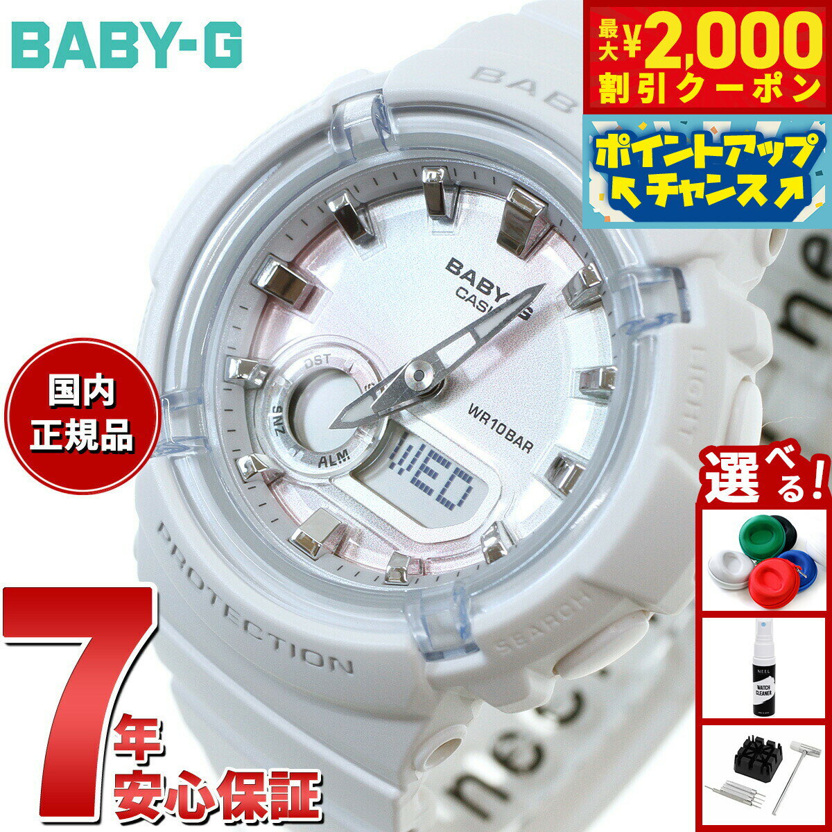 ↑↑↑正確な在庫状況は上記バナー「在庫状況を確認する」をクリックして頂き、必ずご確認ください。 長期保証をご希望のお客様は下記の表より「商品+長期保証」のページへ移動してご注文ください。※長期保証は法人加入や業務使用、譲渡や再販はご利用いただけません。 ■ベースモデルはシンプルデザインとワイドフェイスが人気のBGA-150■ベゼルにゴールドのIP(イオンプレ-ティング)処理を施し、一段上の上質感をプラスしました■日付やワールドタイム、ストップウオッチなどを表示するデジタル液晶の小窓を3つ備えているので実用性も兼備ベルト調整は承っておりません。メーカー(輸入時計は、正規代理店・特約店)からの直接仕入れ商品です。メーカー保証をお付けしております。BGA151EF1BJFムーブメント:クオーツ式キャリバー:5257シリーズ名:BABY-G(ベイビージー)表示方式:デジタル/アナログ防水機能:10気圧防水ライト:○電波自動修正機能:-電池寿命:3年精度:月差±30秒バンドアジャスト:-バンド中留:-素材 ケース:樹脂/ステンレススチール ガラス:無機ガラス バンド:樹脂機能 ワールドタイム:世界27都市(29タイムゾーン、サマータイム設定機能付き)+ GMT(グリニッジ標準時)の時刻表示 ストップウォッチ:1/100秒、60分計、スプリット付 タイマー:セット単位1分、最大セット60分、1秒単位で計測、オートリピート、タイムアップ予告機能付 時刻アラーム:5本(1本のみスヌーズ機能付き)、時報 カレンダー:○ 日付表示:○ 曜日表示:○ 耐衝撃構造(ショックレジスト) 12/24時間制表示切替保証期間:1年本体寸法:縦 47.5×横 42.8×厚さ 12.8mm バンド長:-mm本体質量:約43g付属品 保証書華やかなアラビック数字をインデックスに取り入れたモデル 11,159円 税込 送料別 カードOK レビュー12件 イーベストPC・家電館 ![]() | ||
