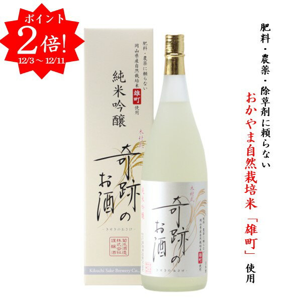 「奇跡のりんご」で知られる木村秋則氏の提唱する肥料・農薬に頼らない自然栽培で収穫した米で醸した、自然の恵みのお酒です。 特に本酒は、岡山の誇る酒米「雄町米」の自然栽培米を栽培委託し、55%まで磨いたこのお米を利用し醸した、芳醇な香りと、雄町のふくよかな旨みがのった純米吟醸酒です。 ※出荷時期によって商品デザインは多少変更される場合がございますが、ご了承ください。 ※ご注文月かその先月の製造年月の商品を発送いたします。 【例】R3年5月ご注文⇒R3年5月又は4月の製造年月の商品 【受賞実績】 ワイングラスでおいしい 日本酒アワード2022 金賞 / 2018 最高金賞 フェミナリーズ世界ワインコンクール2020 TOP OF THE BEST 日本酒 Kura Master2019 金賞[容量違い商品]木村式奇跡のお酒 純米吟醸 雄町 720ml [同カテゴリページ]純米吟醸酒 [木村式関連ページ]奇跡のお酒シリーズ,おかやま自然栽培米 [その他のオススメ商品]当店セット 日本酒人気No.1! 雄町 純米大吟醸&純米 セット 商品詳細 名称 日本酒 商品名 木村式奇跡のお酒 純米吟醸 雄町 内容量 1.8L 原材料 米(国産)・米こうじ(国産米) 原料米 岡山県 自然栽培米「雄町」 精米歩合 55% アルコール分 15度以上16度未満 甘辛度 やや甘口 化粧箱 有り お召し上がり方 ◎冷やして 賞味期限 【目安】未開栓時、製造年月より1年間。 開封後はお早めにお召し上がりください。 保存方法 冷暗所に保管。 製造者 菊池酒造株式会社(岡山県倉敷市玉島) 【商品関連ワード】 日本酒 純米吟醸 木村式奇跡のお酒 雄町 55磨 やや甘口 冷酒 フルーティーな香り ワイングラスでおいしい フェミナリーズ世界ワインコンクール 金賞実績 肥料・農薬を使用し無い 木村式自然栽培米 女性にも飲みやすい 化粧箱 ギフト プレゼント 敬老の日ボックス 岡山 倉敷 玉島 地酒 清酒ギフト プレゼント 敬老の日 贈り物 贈答 プレゼント お中元 中元 御中元 夏ギフト プレゼント 敬老の日 敬老の日 お正月 クリスマス お誕生日 お土産 宅飲み ご自宅用にも ギフト プレゼント 敬老の日包装 ギフト プレゼント 敬老の日梱包 無料ラッピング 熨斗 内のし 御礼 内祝 御祝 無地 快気内祝 内祝 志 御見舞 紅白蝶結び 紅白結び切り 酒蔵直送★★菊池酒造のお酒はこんなキーワードで選ばれています!★★◇お酒の選び方 日本酒 清酒 地酒 1800ml 1.8L 一升瓶 のし 一升びん 木村式 奇跡のお酒 奇跡の酒 酒蔵直送 岡山 岡山県産 倉敷 玉島 国産 日本産 老舗 家飲み 宅飲み パーティー 女子会 吟醸 純米吟醸 冷酒 酒米 酒造好適米 雄町 雄町米 コンクール ワイングラスでおいしい 日本酒アワード フェミナリーズ世界ワインコンクール 金賞 金メダル TOP OF THE BEST SAKE 受賞 実績 フルーティー やや 甘口 中口 華やか エレガント 美味しい おいしい 飲みやすい 旨い キレ 送料無料 1本 5000円 五千円 以内 程度 ラベル ボトル デザイン かっこいい おしゃれ オシャレ 人気 好評 映え 話題 有名 ランキング 女性 初心者 日本酒通◇自然栽培米で醸す地酒 奇跡のりんご 木村秋則 氏 監修 岡山県産 自然栽培 米 100%.使用 肥料 農薬 除草剤 に頼らない おかやま 自然栽培米 (R5年産米以降) [ 木村式 自然栽培 朝日米 (R4年産米以前)] で醸造 NPO法人 岡山県 自然栽培 実行委員会◇ご挨拶のシーン ごあいさつ 御挨拶 御進物 御贈答 贈り物 ギフト プレゼント 敬老の日 プレゼント 誕生日 お誕生日 お礼 御礼 謝礼 御祝 お祝い 内祝 寸志 気持ちばかり 粗品 御婚約祝 婚約祝 御結婚祝 結婚祝 御出産祝 出産祝 還暦祝 還暦御祝 古希祝 喜寿祝 御開店 御祝 開店祝 御開業御祝 開業祝 周年御祝 周年記念 新築御祝 結婚記念日 金婚式 銀婚式 引き出物 御引出物 慶事 奉献 奉納 玉串料 御初穂料 初穂料 祭り 餞別 二次会 記念品 コンペ 景品 お土産 手土産 お返し お見舞 御見舞 御快気祝 快気祝 全快祝 御退院祝 退院祝 御引越 引越祝 引越御挨拶 弔事 法事 法要 仏事 御香典 香典返し 御霊前 御仏前 御佛前 御供 お供え 粗供養 ◇季節のギフト プレゼント 敬老の日 シーズンギフト プレゼント 敬老の日 中元 お中元 御中元 夏ギフト プレゼント 敬老の日 お父さん ありがとう 中元 お中元 御中元 夏ギフト プレゼント 敬老の日ギフト プレゼント 敬老の日 中元 お中元 御中元 夏ギフト プレゼント 敬老の日プレゼント 中元 お中元 御中元 夏ギフト プレゼント 敬老の日 プレゼント飲み比べ 中元 お中元 御中元 夏ギフト プレゼント 敬老の日プレゼントお酒 母の日 プレゼント ギフト プレゼント 敬老の日 おしゃれ オシャレ 3000円 お母さん ありがとう 化粧箱入り 箱入り 箱付き ボックス プチギフト プレゼント 敬老の日 熨斗 御中元 お中元 御 お 冬ギフト プレゼント 敬老の日 夏ギフト プレゼント 敬老の日 春ギフト プレゼント 敬老の日 秋 御年賀 お年賀 お正月 寒中見舞 バレンタインデー バレンタイン ホワイトデー 桃の節句 雛祭り ひな祭り ひなまつり 端午の節句 敬老の日 御長寿 ご長寿 祖父母 合格祝い 御進学 進学祝 御退職 退職祝 定年祝 御卒業 卒業祝 