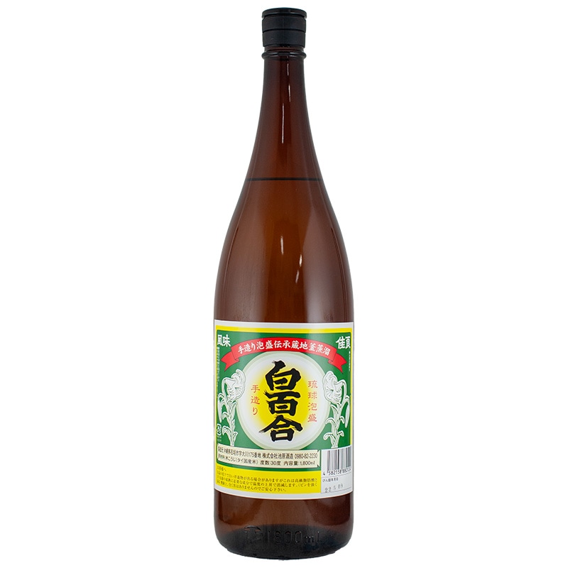 2121. 白百合 30% 1800ml 池原酒造 濃厚な「香り」と「風味」を誇る逸品 商品概要 昔ながらの手造り製法を大切に、造れる量だけを丁寧に製造しています。洗米から蒸留まで一貫して手作業で行い、添加物なしの100%天然醸造と、直火釜での蒸留にこだわった泡盛です。 春先に石垣島の野原で咲く百合の花。その清潔感や、さわやかさを感じてほしいと命名しました。 芳醇な香りとすがすがしい甘みのある、風味豊かな泡盛です。 商品スペック 生産者 池原酒造 内容量 1800ml 原産地 沖縄県 種別 泡盛 原料 米(タイ産米)、米麹 蒸留方法 アルコール度数 30度 ※20歳未満の方の飲酒は法律で禁止されています 5,071円 税込 送料別 カードOK 君嶋屋 楽天市場店 ![]() | ||