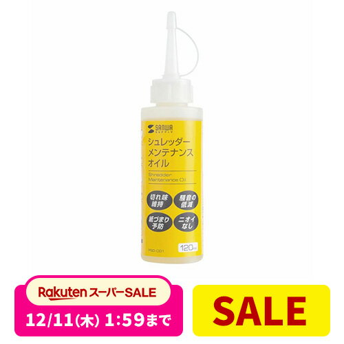 商品詳細シュレッダーの切れ味を維持するメンテナンス用オイル。紙づまりの防止、騒音の低減にも。特長●電動式・手動式シュレッダーともに使えるシュレッダーメンテナンスオイルです。●DVD・CD投入口など、すべての投入口で使用できます。●シュレッダーの切れ味を維持し、紙づまりを防止します。●騒音を軽減します。●植物油だから、嫌なニオイがしません。≪ご注意≫※本製品をシュレッダーの刃のメンテナンス以外で使用しないでください。※機器本体の取扱説明書、あるいは本体メーカーに相談の上、使用に問題が無いことを確認してください。※熱、直射日光を避け、高温になる場所では使用、保管しないでください。※幼児には使用させないでください。幼児の手の届かないところへ保管してください。※万一飲み込んだ場合は吐かせてください。目に入った場合はすぐに水洗いし、どちらの場合も医師の診断を受けてください。※皮膚についたときは、水で十分に洗い流してください。※本製品を使用後はキャップをしめ、涼しく、乾燥したよく換気された場所に保管してください。仕様■主成分:大豆油■内容量:120ml■サイズ:W40×D40×H170mm■重量:125g■原産国:中国≪消防法に関して≫第四類 動植物油類 危険等級III 火気厳禁引火点(Flash Point)318℃沸点(Boiling Point)310℃【2023年10月登録】関連キーワード:サンワサプライ⇒こちらの商品のレビューを、もっと読みたい方はこちら 1,180円 税込 送料込 カードOK レビュー12件 サンワダイレクト楽天市場店 ![]() | ||