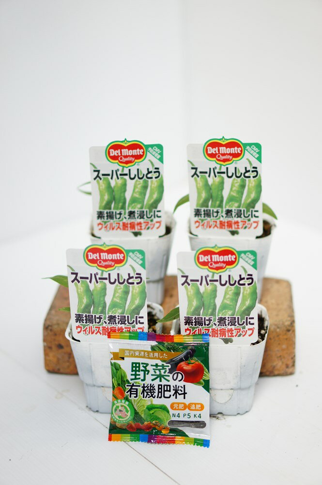 素揚げ、煮浸しに ウイルス耐病性アップ 日本デルモンテアグリ スーパーししとう 植え付け 遅霜の心配がなくなり暖かくなった頃、日当たりと風通しのよい所で、水はけのよい土に肥料をよく混ぜ込み、植え付けます。 プランター栽培では、苗1本に容量15以上が目安です。 植え付け後は、仮支柱で固定します。 支柱立て・誘引 枝は3~4本仕立てとし、各枝に沿って支柱を立て、麻ひも等でゆるめに留めて固定します。 追肥 果実が大きくなりはじめたら、2~3週間に1回程度、肥料を与えます... 2,080円 税込 送料別 カードOK 日光種苗 ![]() | ||