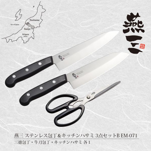 ギフトサービスについて【メール便(クリックポスト)の配送について】※こちらの商品は、[メール便(クリックポスト)]での発送となります。※他商品との同梱された場合は、[宅配便]での発送となり通常の送料が掛かります。※[他商品との同梱][代金引換][配達日時指定]でのご注文をお受けできません。※原則ポスト投函となります。通常の[宅配便]と違い配達までのお時間が掛かる場合があります。和平フレイズ●三徳包丁商品サイズ(約):全長285mm、刃渡り165mm商品重量(約):110g●牛刀包丁商品サイズ(約):全長300mm、刃渡り180mm商品重量(約):110g●キッチンハサミ商品サイズ(約):79×190×10mm商品重量(約):70g■生産地:日本■素材・成分:●ステンレス包丁/刀身:ステンレス刃物鋼、ハンドル:ポリプロピレン・ナイロン●キッチンハサミ/刃部:ステンレス刃物鋼、ハンドル:ABS樹脂■パッケージ:個別箱燕三(えんぞう)シリーズ早くから鍛冶が行われ、日本一のハウスウェア生産地へと成長した新潟県燕市。そこから道具作りの原点に立ち、先人への感謝と地域の誇りで生み出されたのが『燕三』シリーズです。●ステンレス包丁金物の街として有名な新潟県燕三条地区の職人が丹精込めて仕上げた包丁です。刀身は錆びに強く扱いやすいステンレス刃物鋼。衛生的な樹脂ハンドルを使用。刀身と三本の鋲でしっかり固定されているため抜けにくく、耐久性に優れます。●キッチンハサミ食材のカット、袋の開封、ギンナンやくるみの殻割り、ねじ込み式キャップの開閉など、多用途に使えます。刃の表面に細かいギザ刃加工を施してあるので、お肉や魚も滑らずに切れます。レトルト食品のツルツルしたビニール包装を切る時にも便利。●セット内容:三徳包丁・牛刀包丁・キッチンハサミ×各1商品特徴一覧1034487、和平フレイズ、生活雑貨 → 食器・キッチン → 調理器具 → 包丁・ナイフ → 包丁セット、4903779475016、通信販売、通販、販売、買う、購入、お店、売っている、ショッピング▼関連商品はこちら。燕三 ステンレス三徳包丁&キッチンハサミ EM-069 [日本製]燕三 ステンレス包丁&キッチンハサミ3点セットA EM-070 [日本製]燕三 ステンレス包丁&キッチンハサミ4点セット EM-072 [日本製]【燕三 ステンレス包丁&キッチンハサミ3点セットB EM-071 [日本製]】広告文責(有)イースクエアTEL:0120-532-772和平フレイズ●三徳包丁商品サイズ(約):全長285mm、刃渡り165mm商品重量(約):110g●牛刀包丁商品サイズ(約):全長300mm、刃渡り180mm商品重量(約):110g●キッチンハサミ商品サイズ(約):79×190×10mm商品重量(約):70g■生産地:日本■素材・成分:●ステンレス包丁/刀身:ステンレス刃物鋼、ハンドル:ポリプロピレン・ナイロン●キッチンハサミ/刃部:ステンレス刃物鋼、ハンドル:ABS樹脂■パッケージ:個別箱燕三(えんぞう)シリーズ早くから鍛冶が行われ、日本一のハウスウェア生産地へと成長した新潟県燕市。そこから道具作りの原点に立ち、先人への感謝と地域の誇りで生み出されたのが『燕三』シリーズです。●ステンレス包丁金物の街として有名な新潟県燕三条地区の職人が丹精込めて仕上げた包丁です。刀身は錆びに強く扱いやすいステンレス刃物鋼。衛生的な樹脂ハンドルを使用。刀身と三本の鋲でしっかり固定されているため抜けにくく、耐久性に優れます。●キッチンハサミ食材のカット、袋の開封、ギンナンやくるみの殻割り、ねじ込み式キャップの開閉など、多用途に使えます。刃の表面に細かいギザ刃加工を施してあるので、お肉や魚も滑らずに切れます。レトルト食品のツルツルしたビニール包装を切る時にも便利。●セット内容:三徳包丁・牛刀包丁・キッチンハサミ×各1※お客さま都合による、ご注文後の[キャンセル][変更][返品][交換]はお受けできませんのでご注意下さいませ。※当店では、すべての商品で在庫を持っておりません。記載の納期を必ずご確認ください。※ご注文いただいた場合でもメーカーの[在庫切れ][欠品][廃盤]などの理由で、[記載の納期より発送が遅れる][発送できない]場合がございます。その際は、当店よりご連絡させていただきます。あらかじめご了承ください。※リニューアル等により パッケージ、仕様、セット内容 が変更になる場合がございます。予めご了承下さい。【メール便(クリックポスト)の配送について】※こちらの商品は、[メール便(クリックポスト)]での発送となります。※他商品との同梱された場合は、[宅配便]での発送となり通常の送料が掛かります。※[他商品との同梱][代金引換][配達日時指定]でのご注文をお受けできません。※原則ポスト投函となります。通常の[宅配便]と違い配達までのお時間が掛かる場合があります。こちらの商品は【お取り寄せ(14営業日以内に発送予定)】となります。あらかじめご了承くださいませ。 9,050円 税込 送料込 カードOK イースクエア ![]() | ||