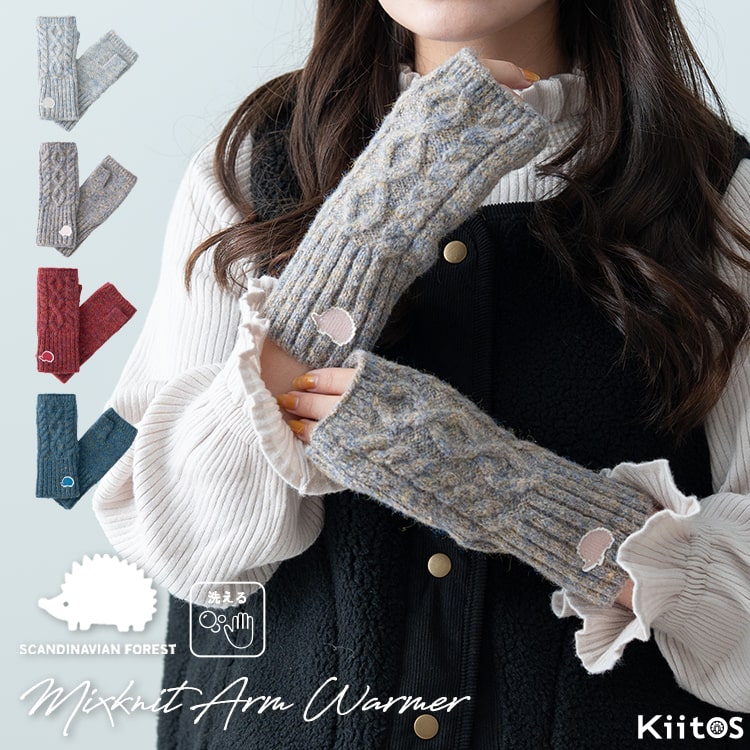 大人気「スカンジナビアフォレスト」からフィンガーレス手袋が登場! 本体素材はミックス調のニット糸を採用。温かみのある色合いとケーブル編みが相性バッチリ◎ 肘下までのショート丈だから肘周りがもたつかず、アウターやトップスとの相性も抜群。 親指用の指穴付き&フィンガーレス仕様で、着けたままスマホ操作もOK! 手首側はリブ仕様になっており、伸縮性も◎ お家で手洗いが出来るのでいつでも清潔に使えるのもポイントです。 冷え対策にも、コーデのアクセントにもおすすめのアイテムです。 サイズ フリーサイズ ・手囲い:約20cm ・手先側幅:約8cm ・肘側幅:約7.5cm ・全長:約21cm手囲いとは下記AとBを通って手のひらを1周した時の長さです。 A:親指の第一関節とほぼ同じ位置になる生命線の始点 B:小指の付け根と手首までの間を三分割にした時の手首から1/3の点 素材 ポリエステル89% アクリル10% ポリウレタン1% 重さ 約65g 仕様 裏地:なし 伸縮性:あり スマホ操作:可 手洗い可能 原産国 中国 メール便 可他の手袋・アームカバーもチェック! 1,210円 税込 送料込 カードOK レビュー2件 神戸岡本Kiitos ![]() | ||