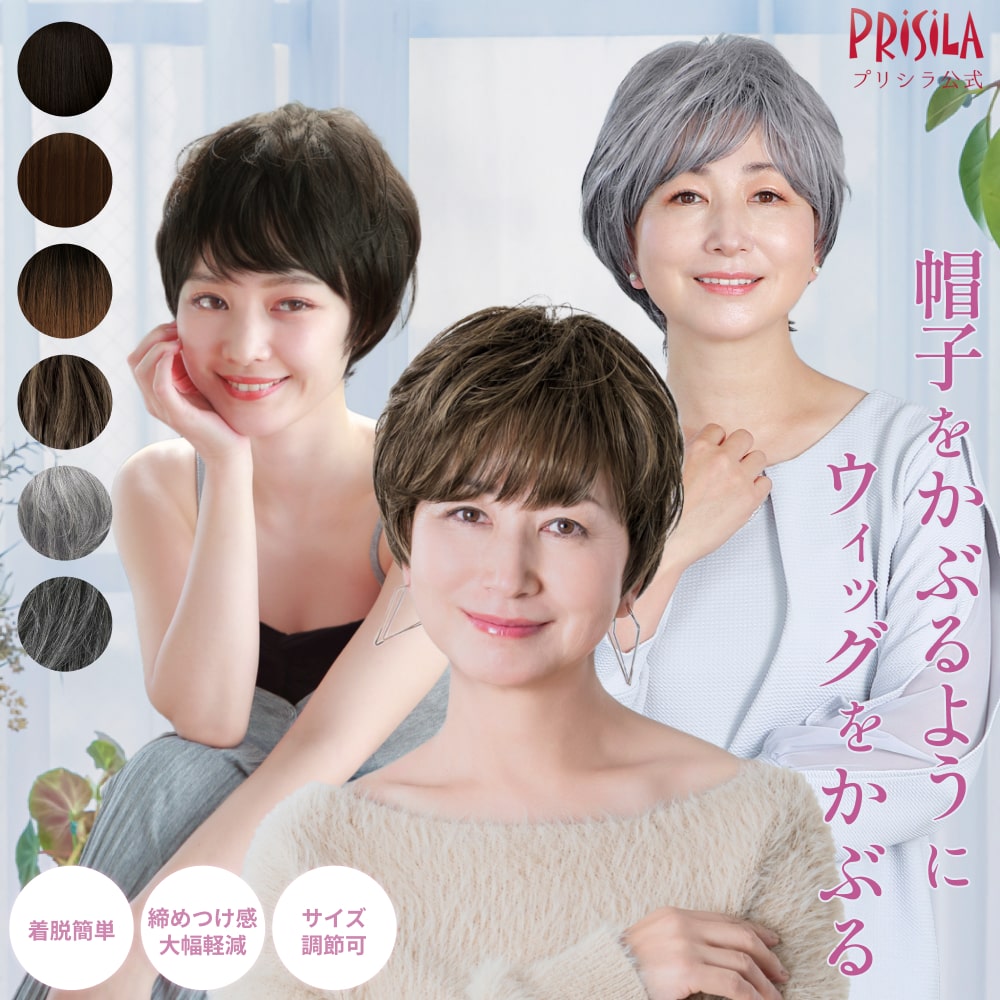 ウィッグの内側が帽子になった、帽子ウィッグ-Relax-は、 ・着脱簡単で締め付け感を大幅に軽減 ・面ファスナーのアジャスターで簡単にサイズ調整が可能 ・留め具が付いていないので頭皮にストレスがかかりません。 ・伸縮性抜群で長時間着用していても、頭が痛くなりにくいです。 ・人工スキン付きで自然なつむじは、本物の頭皮のような質感! 真上から見られてもウィッグだと気付かれにくいです。 帽子ウィッグシリーズはお財布にやさしい価格設定です。 治療費がかさんでしまいがちな医療用ウィッグとしてもおすすめ。 医療用として 内側の帽子は、柔らかな肌触りで快適な着け心地! 治療等で脱毛されている方にも、かぶっていただけます。帽子ウィッグはこめかみ部分にもワイヤーがついておらず、 金属素材は不使用のためMRIやCTスキャン時も着用可能です。 OMOTENASHI Selection 金賞受賞 OMOTENASHI Selectionとは使う人を思いやる心から生まれたこだわり、現代に向けて改良を重ねる創意工夫の活動を 「OMOTENASHI」「GLOBAL」の基準で評価いただき日本在住の海外の方に選ばれた賞です。 男性やミセス等、幅広い年齢層・性別に対応おうちでのリラックスタイムやちょっとしたお出かけに医療用としてもオススメです。 ※フカシ加工について こちらの商品はフカシ加工を施してあります。縮れて見える部分はフカシ加工によるもので不良ではございません。 品番BO-01 商品名帽子ウィッグリラックス ショート ウィッグのタイプ帽子タイプのオールウィッグ(フルウィッグ)全頭をすっぽりと覆うかぶるタイプのウィッグ。 ウィッグの内側に「帽子」がついている仕様です。 サイズつむじから前:約21.5cmつむじから後:約29cm頭囲:約54~60cm(自然から伸ばして) 重さ約73g機械植えで一点一点作られているため、重さはおおよその値であり個体差がございます。 一般的に±数グラムの誤差が生じることをあらかじめご了承ください。 ※重さの値には毛だけでなく、クリップやキャップ等の素材やパーツの重さも含まれます 人工スキン有 アジャスター有(面ファスナータイプ) 付属品地毛をまとめるオールウィッグネット(黒) 素材【新ファイバー】国内メーカー製耐熱ファイバーをオリジナルにブレンドすることで 表面に凹凸加工が施されツヤを軽減まるで人毛のような自然なカラーを実現 耐熱耐熱温度:180度適正温度:130~150度コテやカーラーで巻く場合は同封の取扱説明書をご覧ください。 カラーTCK:耐熱ショコラブラックTDB:耐熱ダークブラウンGTDM:耐熱グラデデイリーマロンTCHM:耐熱ココアハイメッシュ※メッシュは個体差がありますTGH:耐熱グレイヘアTDGH:耐熱ダークグレイヘア ※お使いのPCやスマホの液晶によって写真と実物の色が若干異なる場合がございます。予めご了承ください。 商品到着後レビューを書いてくださった方に、次回ご購入時にお使いいただけるクーポンを配布しております。帽子ウィッグのかぶりかた 7,920円 税込 送料別 カードOK レビュー2件 プリシラ公式楽天市場店 ![]() | ||