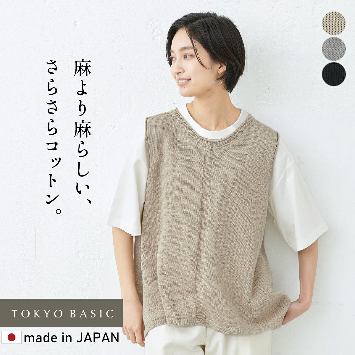 TOKYO BASIC コットン100% ギマコットン100%ノースリーブプルオーバー SIZEフリー COLORシェードベージュ・杢グレー・ブラック カラー シェードベージュ・杢グレー・ブラック サイズ サイズ 前身丈 後身丈 バスト 肩幅 アームホール 裾幅 フリー 約60cm 約62cm 約108cm 約37cm 約22.5cm 約64cm サイズ計測方法はコチラ>>> 原産国 日本製 素材 綿100% 洗濯表記 手洗い 裏地 なし ポケット なし モデル着用サイズ フリーサイズ メール便 × 特徴 ... 5,990円 税込 送料別 カードOK レビュー19件 TOKYO BASIC (東京ベーシック) ![]() | ||