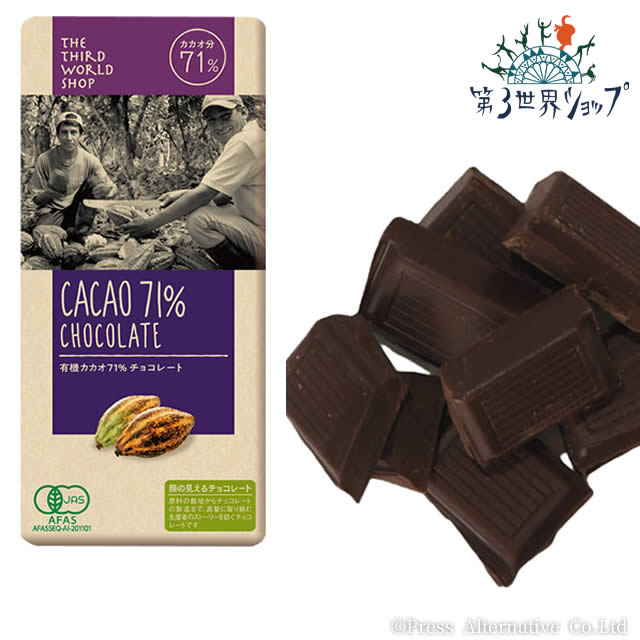 295. カカオ本来の香りとコクがギュッと詰まった1枚!!/オーガニック/フェアトレード/エシカル/有機JAS認証 第3世界ショップ フェアトレードチョコレート 有機カカオ71% チョコレート 80g 商品詳細内容量80g原材料有機カカオマス、有機粗糖、有機ココアバター、有機黒糖、有機バニラ、(一部に乳製分を含む)原料生産国スイス賞味期間24ヶ月保存方法直射日光や高温多湿を避けて下さい輸入者(株)プレス・オールターナティブ/東京都目黒区※開封後はなるべくお早めにお召し上がり下さい。チョコレートは一度溶けると油脂分が白く固まることがあります。風味は落ちますがお召し上がりいただけます。★チョコレートのメール便でのお届けはお受けできません。 メール便は遅延、紛失、配送時の保管状況(高温の場所に保管される等)など、 食品の配送に適さない状況が想定されます。 特に当店で取り扱う食品は、保存料や安定剤などの添加物を使用していないため、一般の食品に比べて品質保持に注意が必要です。 お客様にご負担いただく送料がかさんでしまうことは大変心苦しいのですが、 せっかく品質にこだわって製造された商品ですので、できるだけよい状態でお届けしたいと思っています。どうぞご理解ご了承の程お願い申し上げます。 1枚のチョコレートから繋がる世界 誰が、どこで、どのように作ったかがわかる「顔の見える原材料」を使用しています。フェアトレードの原材料を使用ひとつひとつ厳選して選び抜かれたこだわりの原材料を使用しています。ドミニカ共和国のカカオパラグアイの粗糖コスタリカの黒糖マダガスカルのバニラ板チョコレートは有機JAS認証を取得しています。 昔ながらの伝統製法 乳化剤や人工香料といった添加物を一切使用せず、ココアバターの比率を高め、最長72時間もの時間をかけてじっくり練り合わせる、コンチングという技法により、カカオのアロマを最大限に引き出しています。口に入れた瞬間、豊かなコクとカカオの芳醇な香りが口いっぱいに広がります。 フェアトレードであること大量に安くという一般的な流通ではなく、『顔の見える』安心な原材料、製造工程、また生産者への正当な報酬、環境に配慮したチョコレートです。スイスのチョコレート生産者団体は、ドミニカ共和国のカカオ農家と協働でプロジェクトを立ち上げ、有機栽培カカオの品質向上、小学校の修繕などコミュニティの生活向上に取り組んでいます。農家は高品質なオーガニックカカオ豆の生産者として、仕事に誇りをもっています。カカオ本来の味わいがたっぷり詰まった1枚ビターでももの足りない上級者の方に。口の中にカカオ本来の香りと苦味、そしてコクが広がっていきます。カカオ分約71%。作り手の思いを届けるフェアトレードチョコレート第3世界ショップのフェアトレードチョコレートは、大量生産のため効率を優先させた一般的なチョコレート市場ではなく、顔の見える安心な原材料や製造工程、生産者への正当な報酬、環境への取り組みを考慮したフェアトレードを推進しています。砂糖からバニラに至るまでフェアトレードにより調達され、海外のオーガニック認証を取得した有機栽培のものを使用しています。 このチョコレートを買うことで、途上国の小規模農家の生活向上を応援できます。 1,058円 税込 送料別 カードOK レビュー4件 人と地球にやさしい暮らしてくてく ![]() | ||